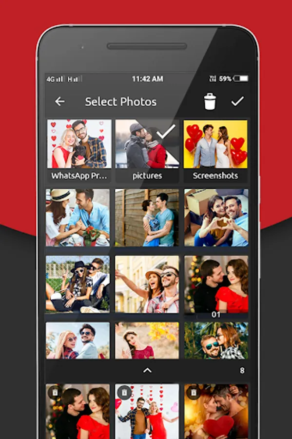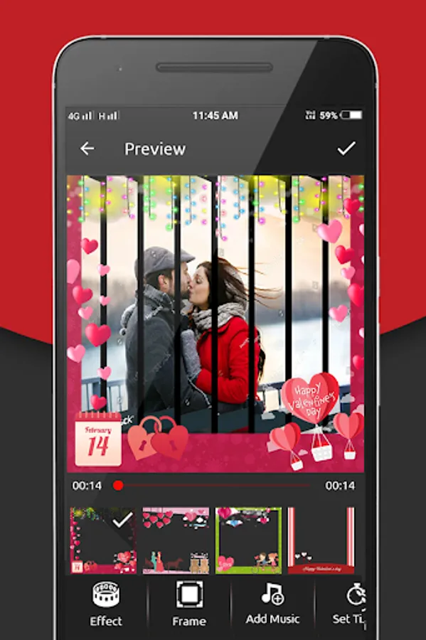 Valentine's Day Video Maker Photo Movie Maker App have reach set of different themes to apply on Couple photos to create video from photos and music.Incredibly easy to use, yet highly powerful and has many options to customize and make it personal.