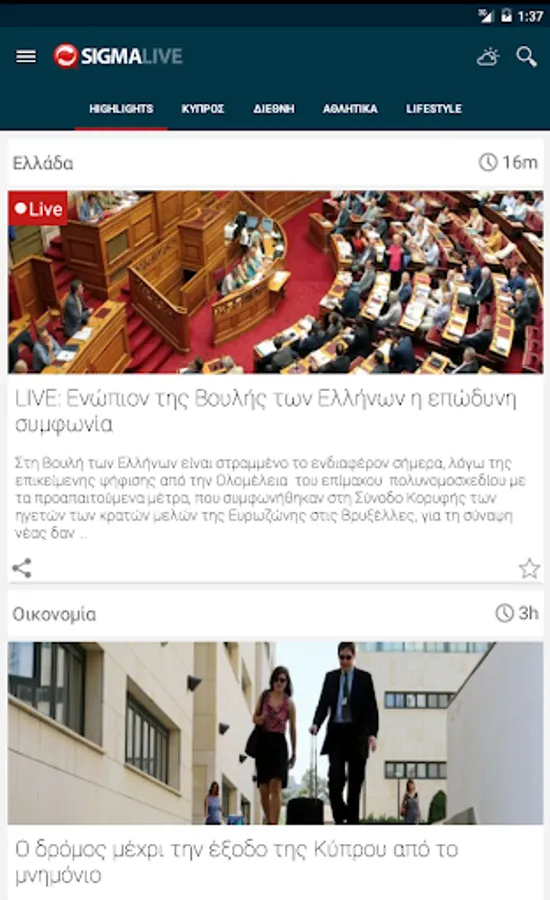 To SigmaLive, το πρώτο ολοκληρωμένο ειδησεογραφικό app της Κύπρου, είναι ένα πρωτοποριακό application που, για πρώτη φορά, παρέχει πέραν της σφαιρικής ενημέρωσης και δυνατότητες για αμφίδρομη επικοινωνία με τους αναγνώστες. Νέες υπηρεσίες όπως το SocialEyes και SocialWrite διευκολύνουν την αποστολή ειδήσεων, εικόνων και πληροφοριών απο τους ίδιους τους χρήστες της εφαρμογής.