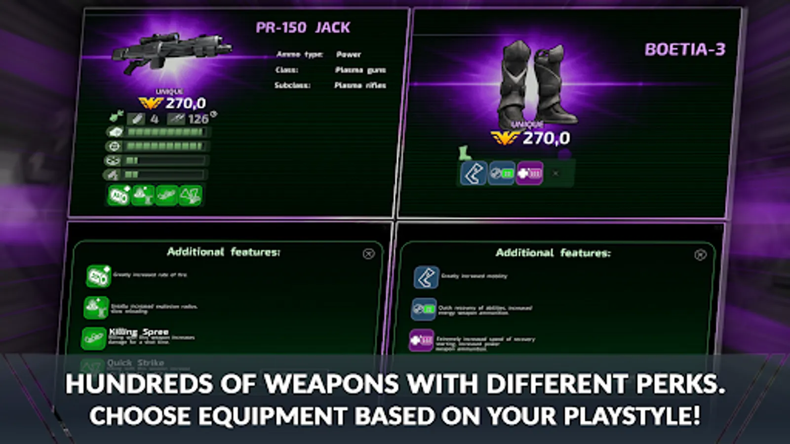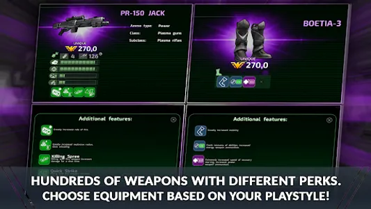 - Many classes of weapons with different perks and characteristics