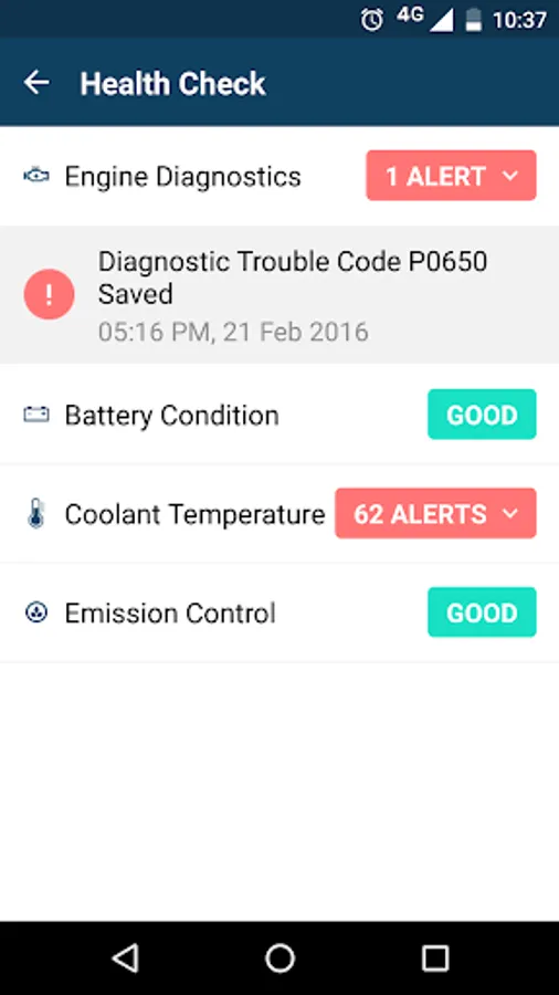 Keep track of your vehicle’s vital parameters and maintenance needs including battery status, coolant temperature and any diagnostics trouble code. Get notified in case the Vehicle Battery is going down or Engine is overheating. Get notified in the App if any specific Engine Diagnostic Trouble Code encountered.