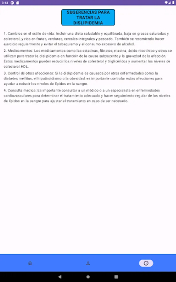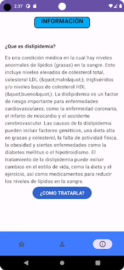 The mobile application that we have developed in Android Studio is a complete and easy-to-use tool for the analysis and information of dyslipidemias, a common disorder related to abnormal levels of lipids in the blood.