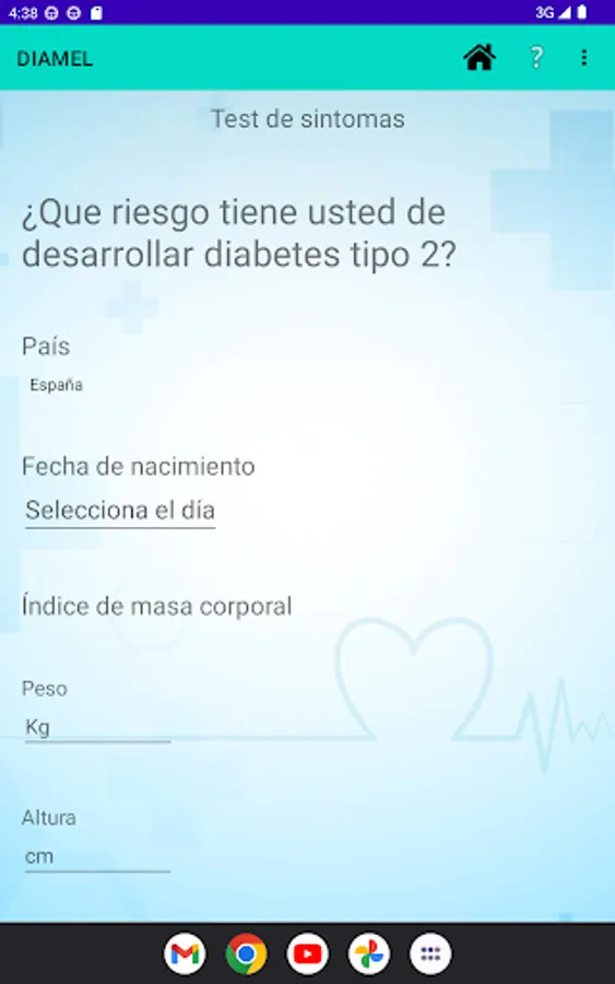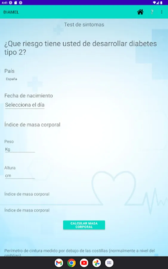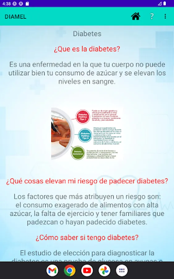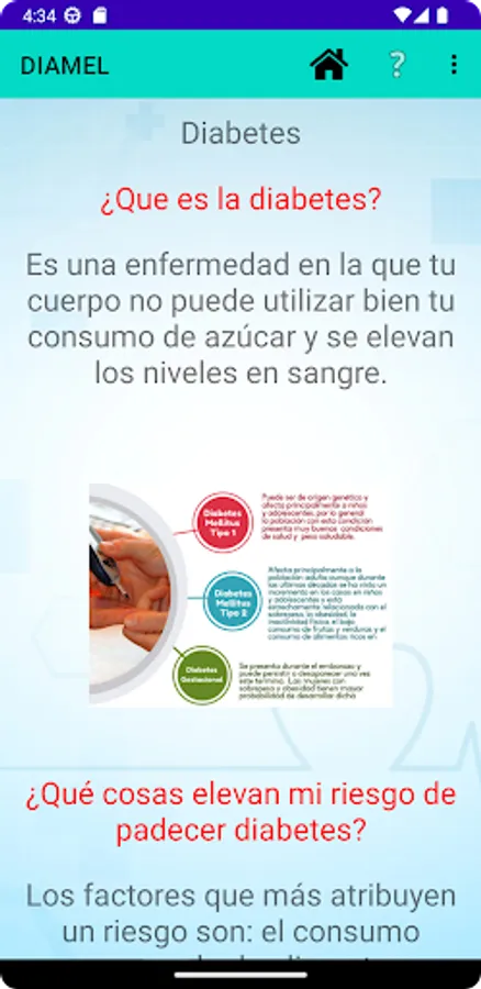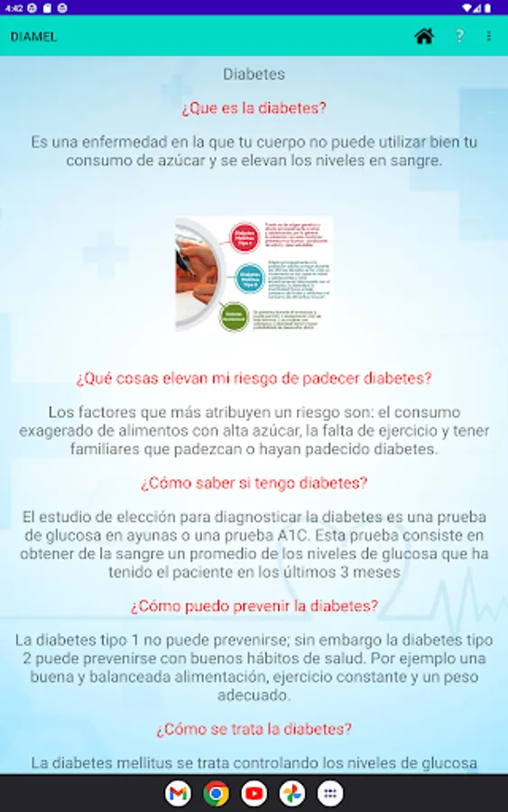 It is an application which is informative regarding diabetes, where you can take a brief test that will guide you about the prevalence of diabetes, however it is not diagnosing you, its objective is that you consult specialists if apparently the result gives you a prevalence.
