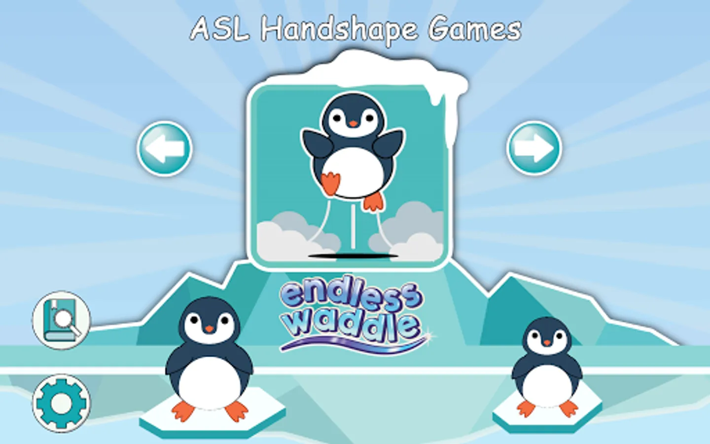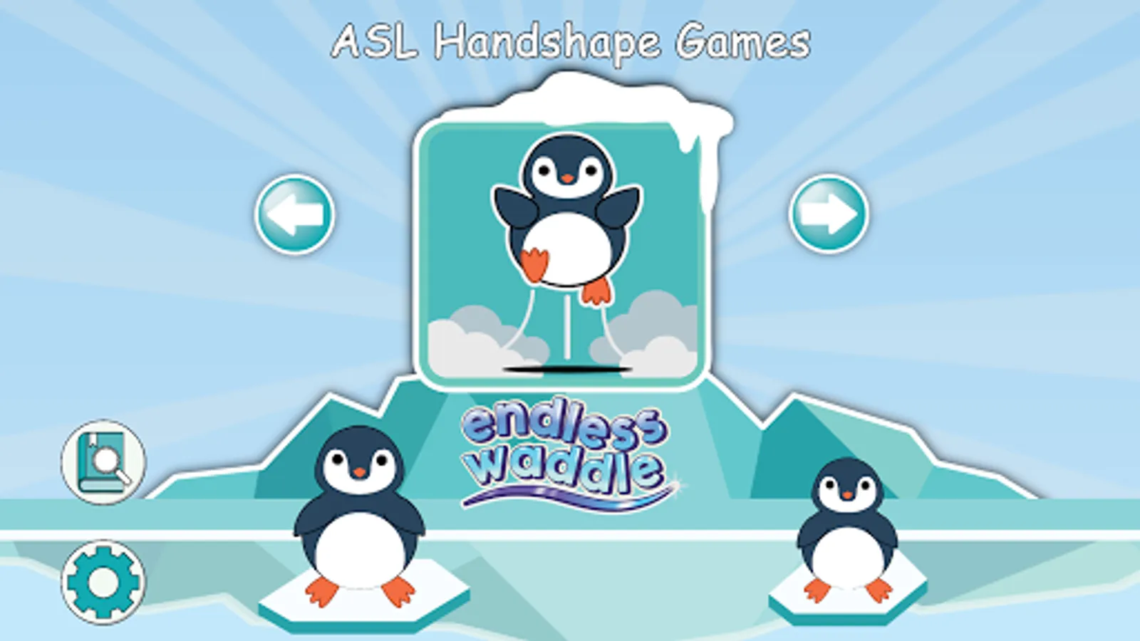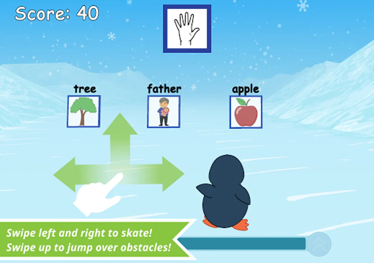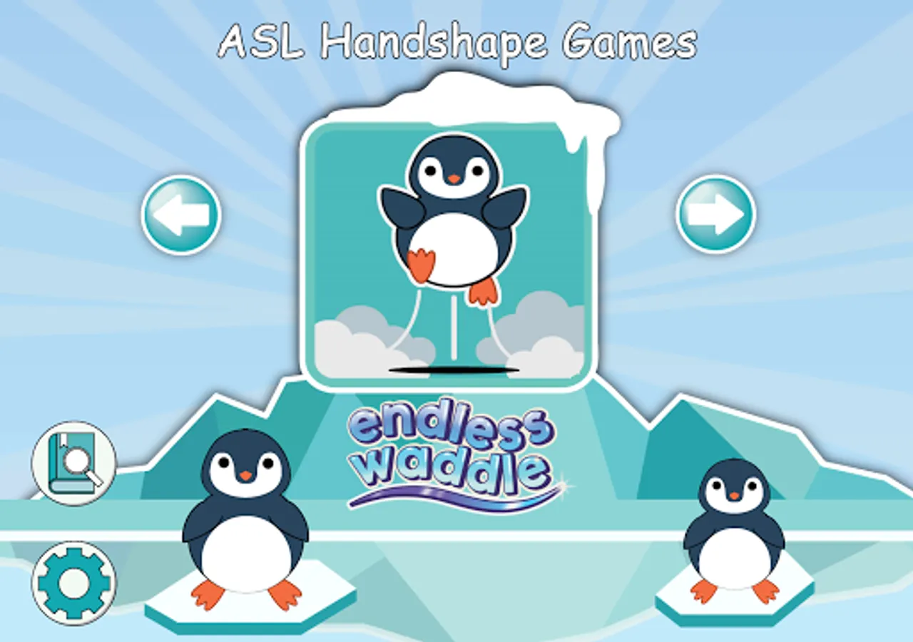 Endless Waddle: Players must help the penguin move through 3 lanes on an icefield and select one picture/text (from a choice of 3) that matches a target ASL handshape. Beware of ice holes!