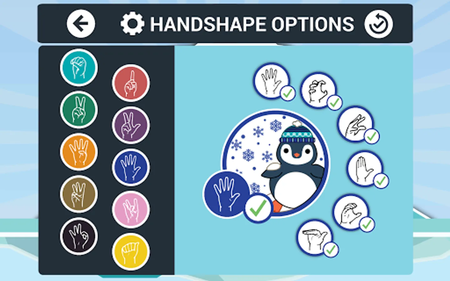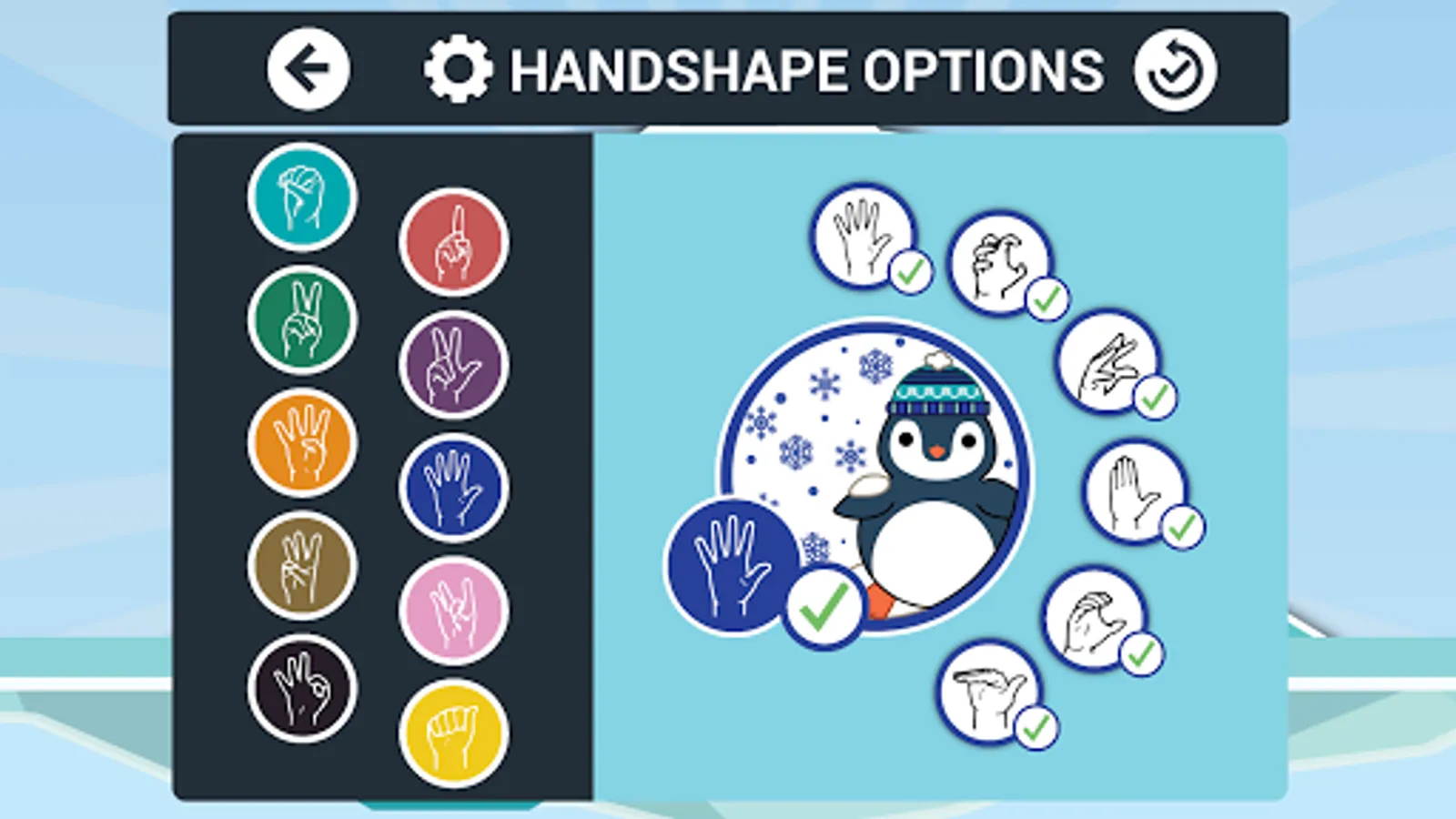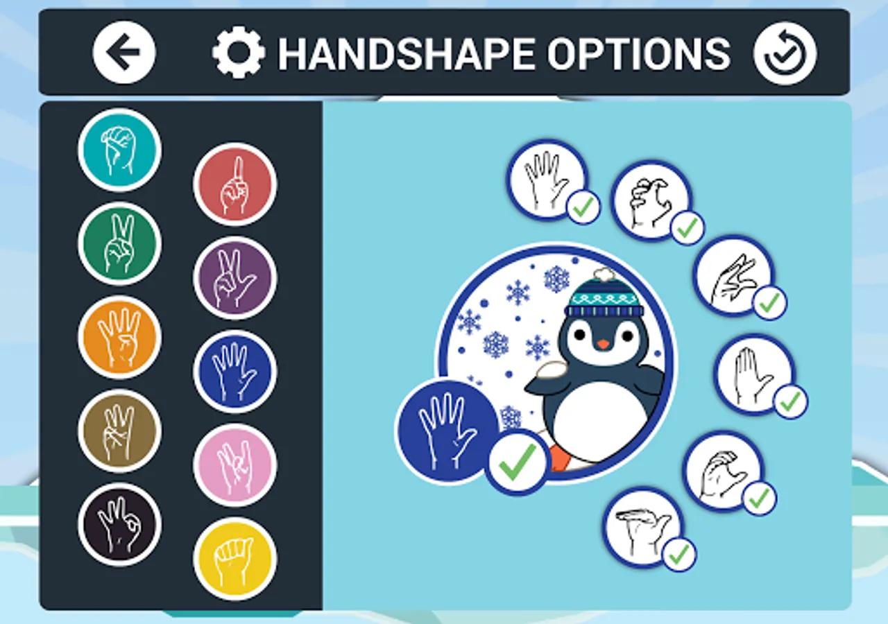Endless Waddle: Players must help the penguin move through 3 lanes on an icefield and select one picture/text (from a choice of 3) that matches a target ASL handshape. Beware of ice holes!