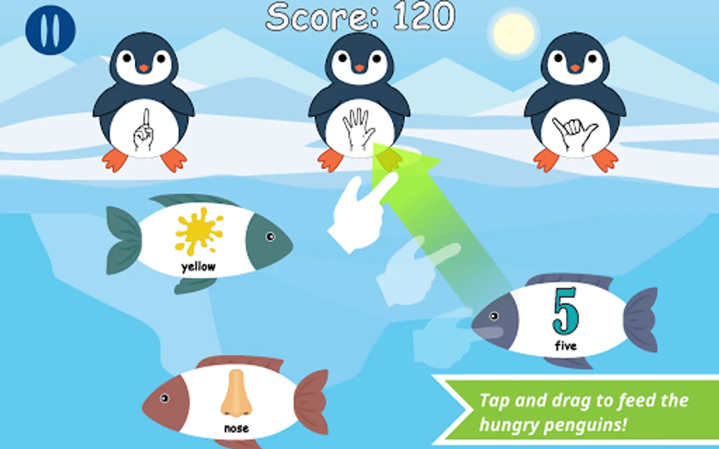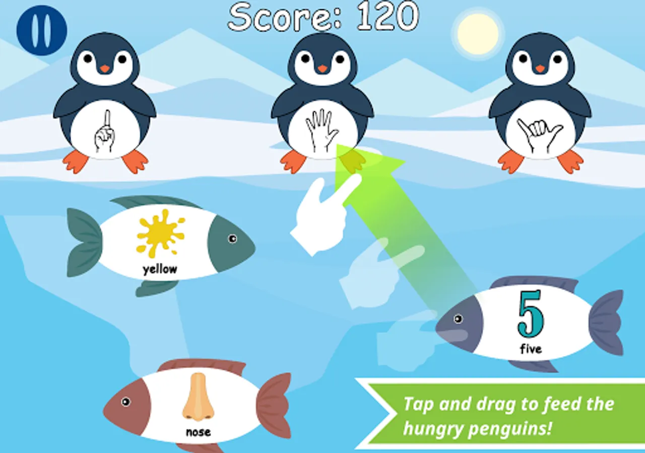 Hungry Penguins: Penguins are standing along a shore and are waiting to be fed! But these penguins are picky eaters! They'll only eat fish whose picture/text matches the ASL handshape on their belly.