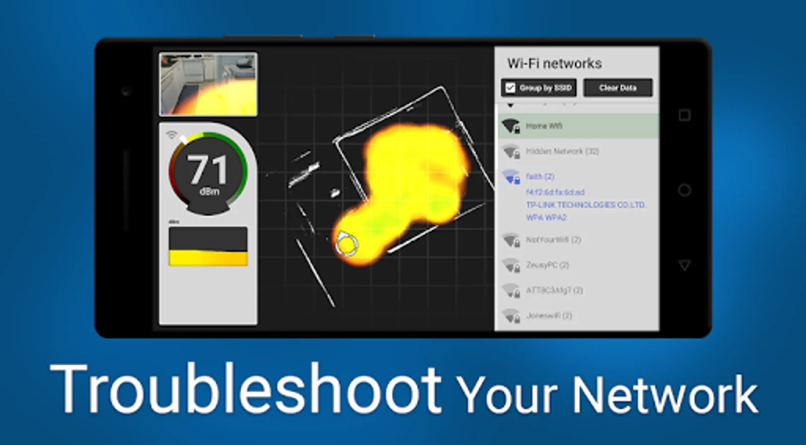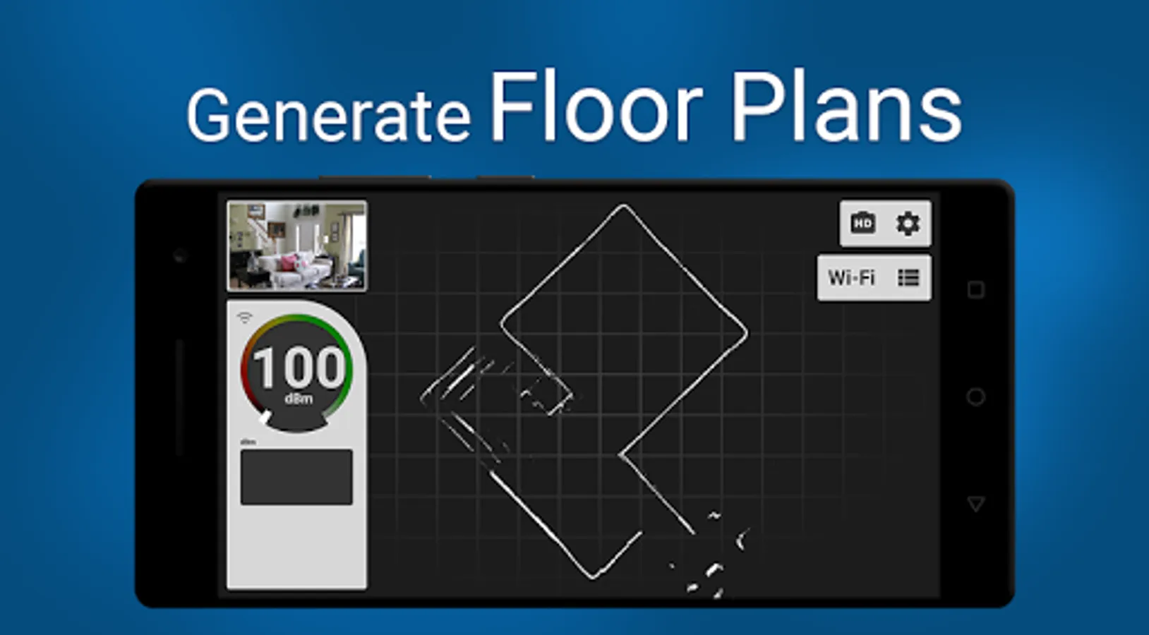 Signal Mapper displays detected signal strengths over auto-generated 3D scanned floor plans, providing the ultimate utility for analyzing wireless signal coverage. Tango technology creates a top-down floor plan in real-time while you analyze Wi-Fi signals on the move.