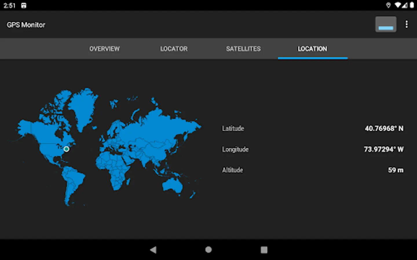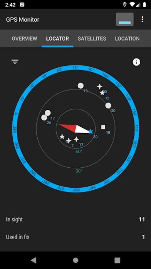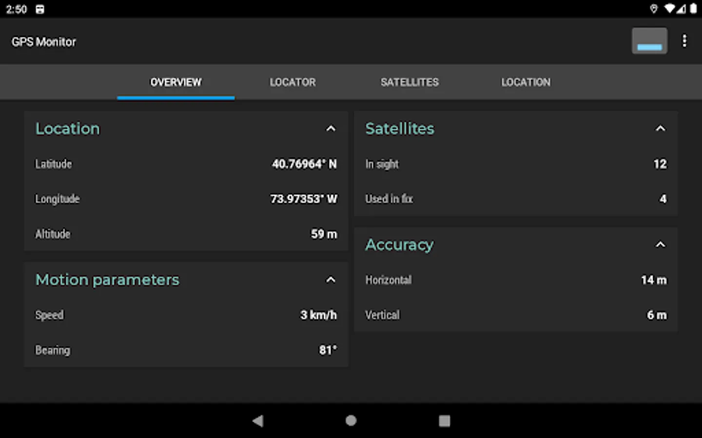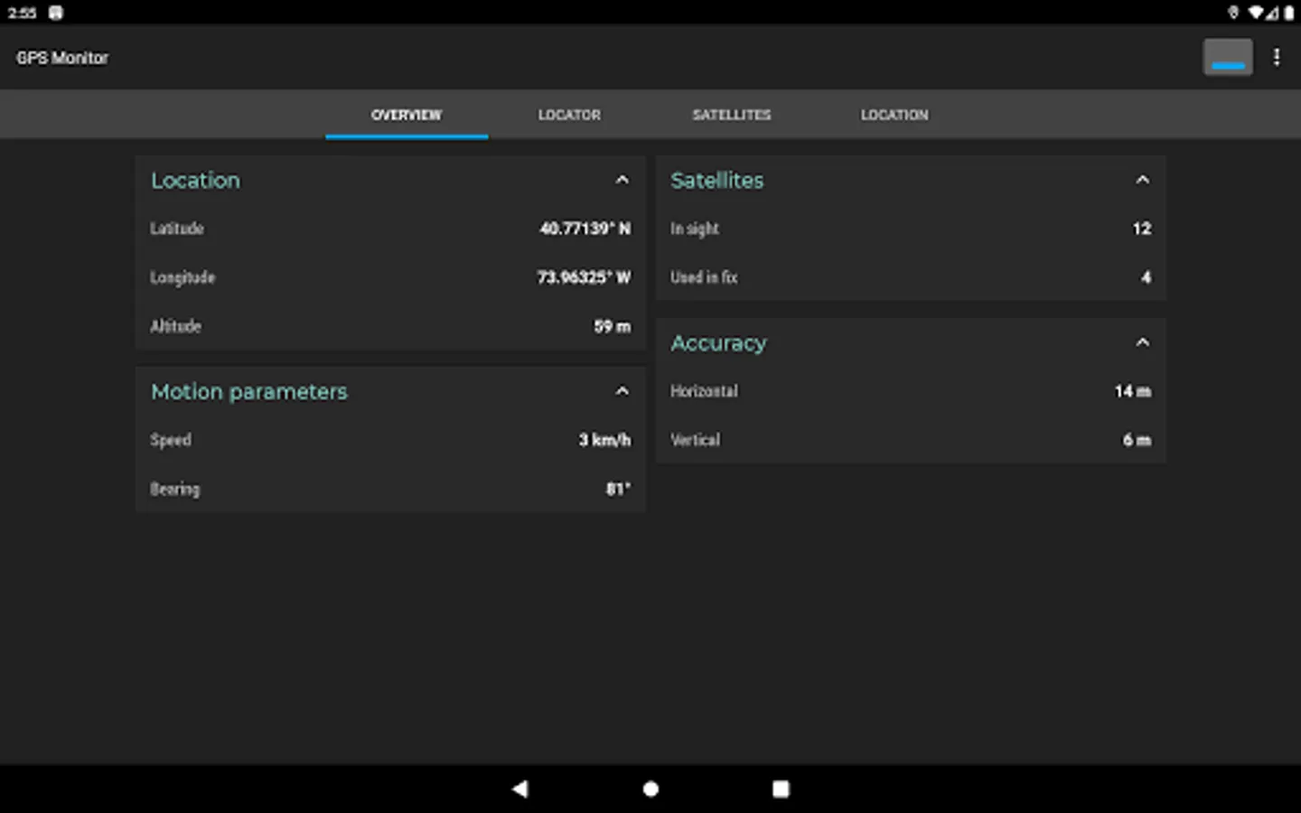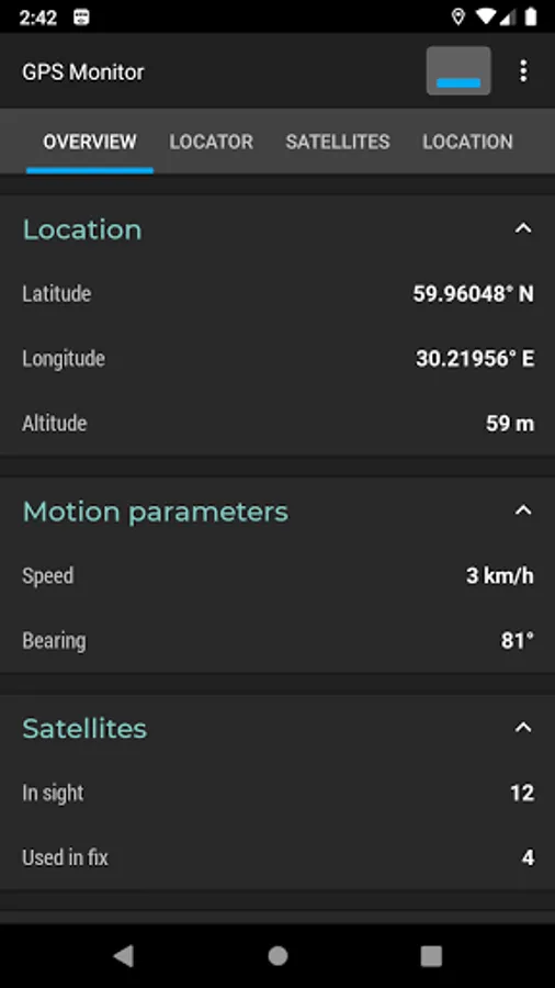 The "Overview" tab contains basic information about the state of the navigation system: longitude, latitude, altitude, heading and speed of your device. The tab shows the total amount of navigation satellites in the field of view and the number of satellites used for positioning.