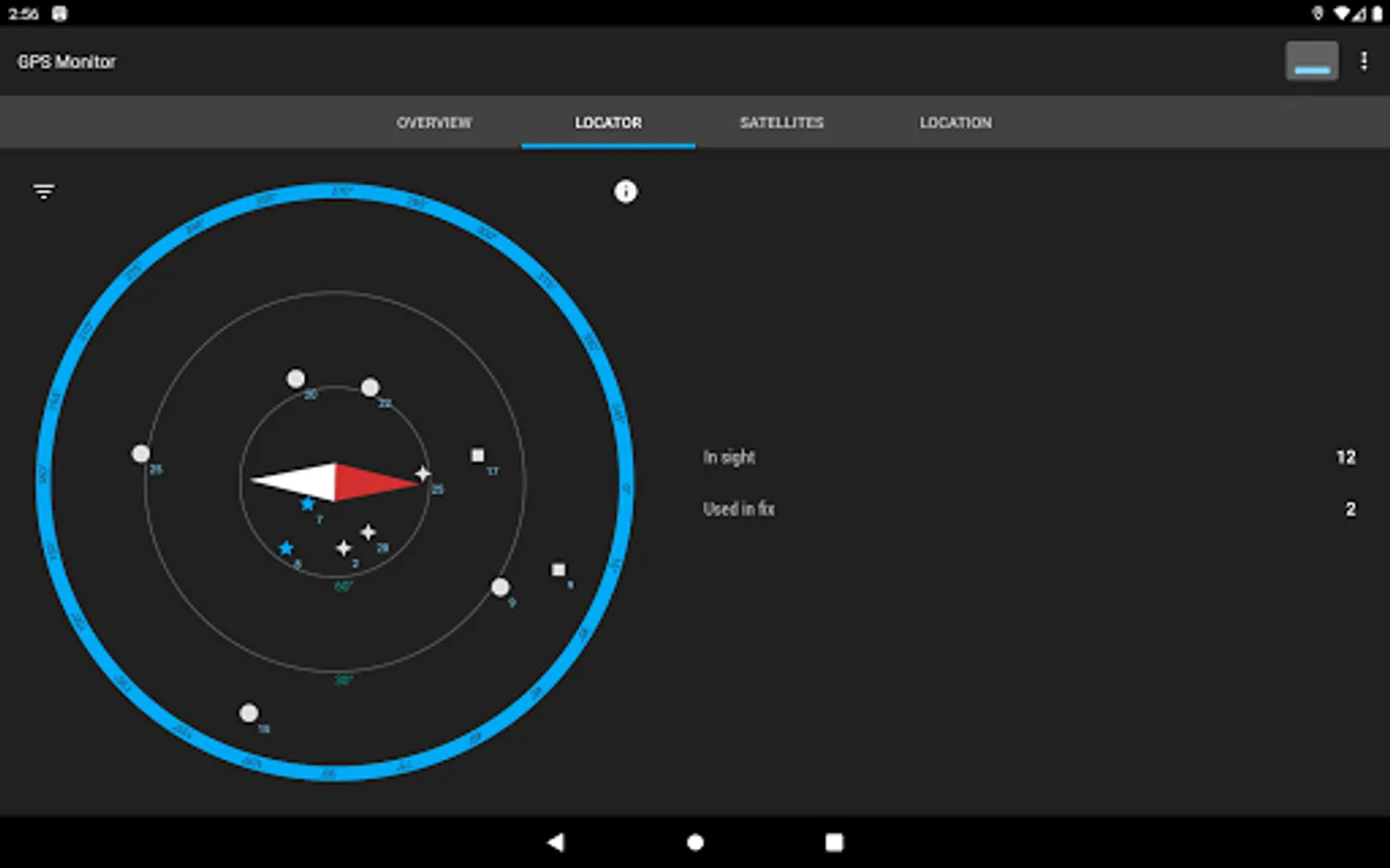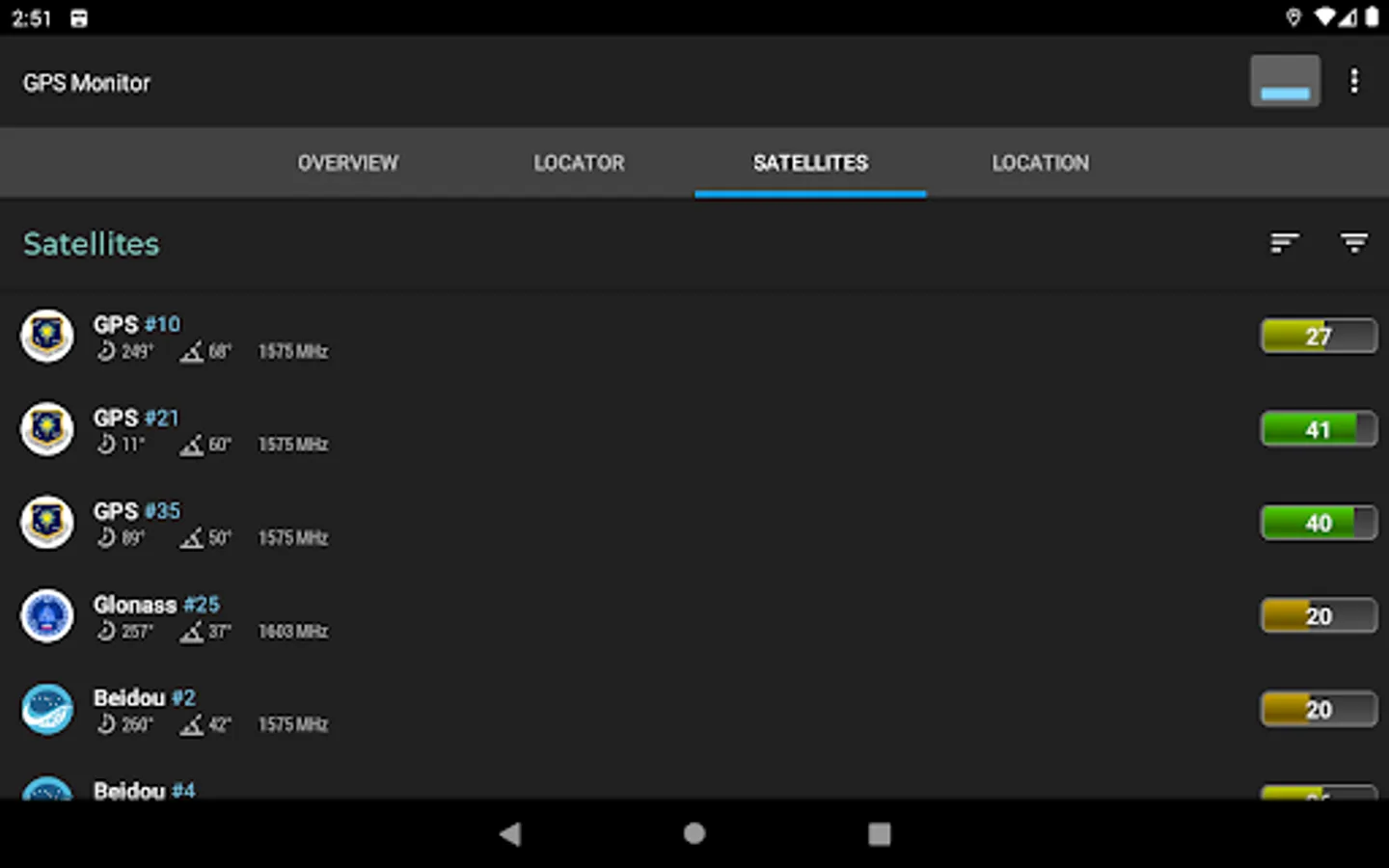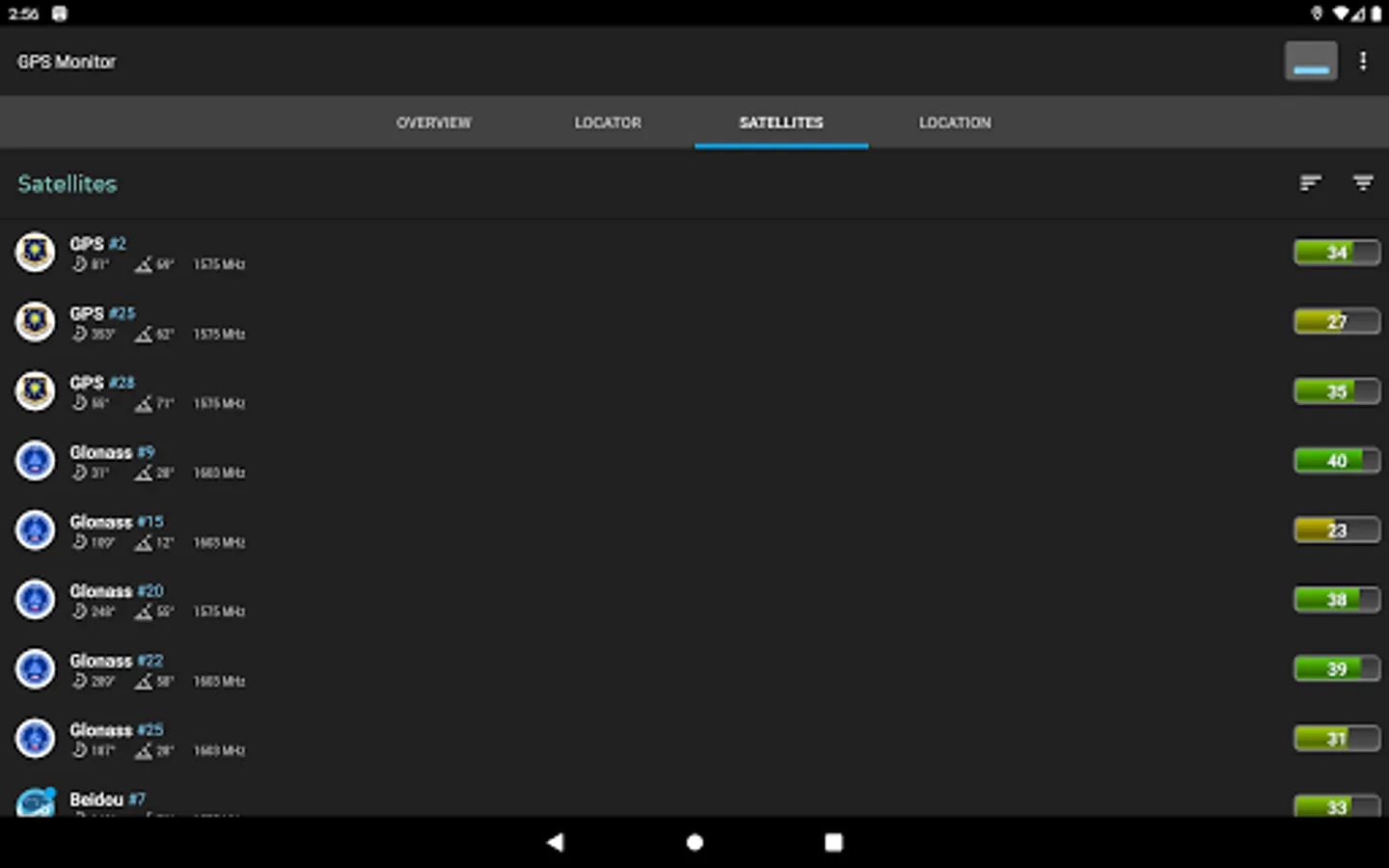 GPS Monitor helps you to check navigation satellites explored by your device and location information they provide. The application displays the objects of the following global navigation satellite systems (GNSS): GPS, GLONASS, Beidou, Galileo and other systems (QZSS, IRNSS). In addition, you can get your current latitude, longitude, altitude, heading and speed data. The application does not require an Internet connection, so you can determine the location even in airplane mode.