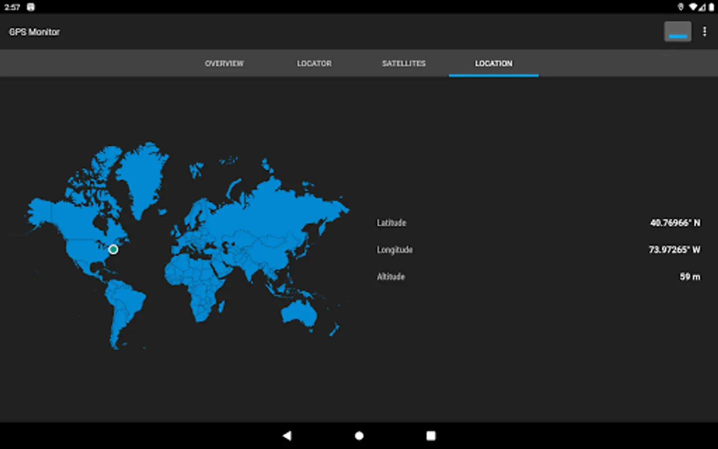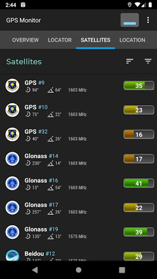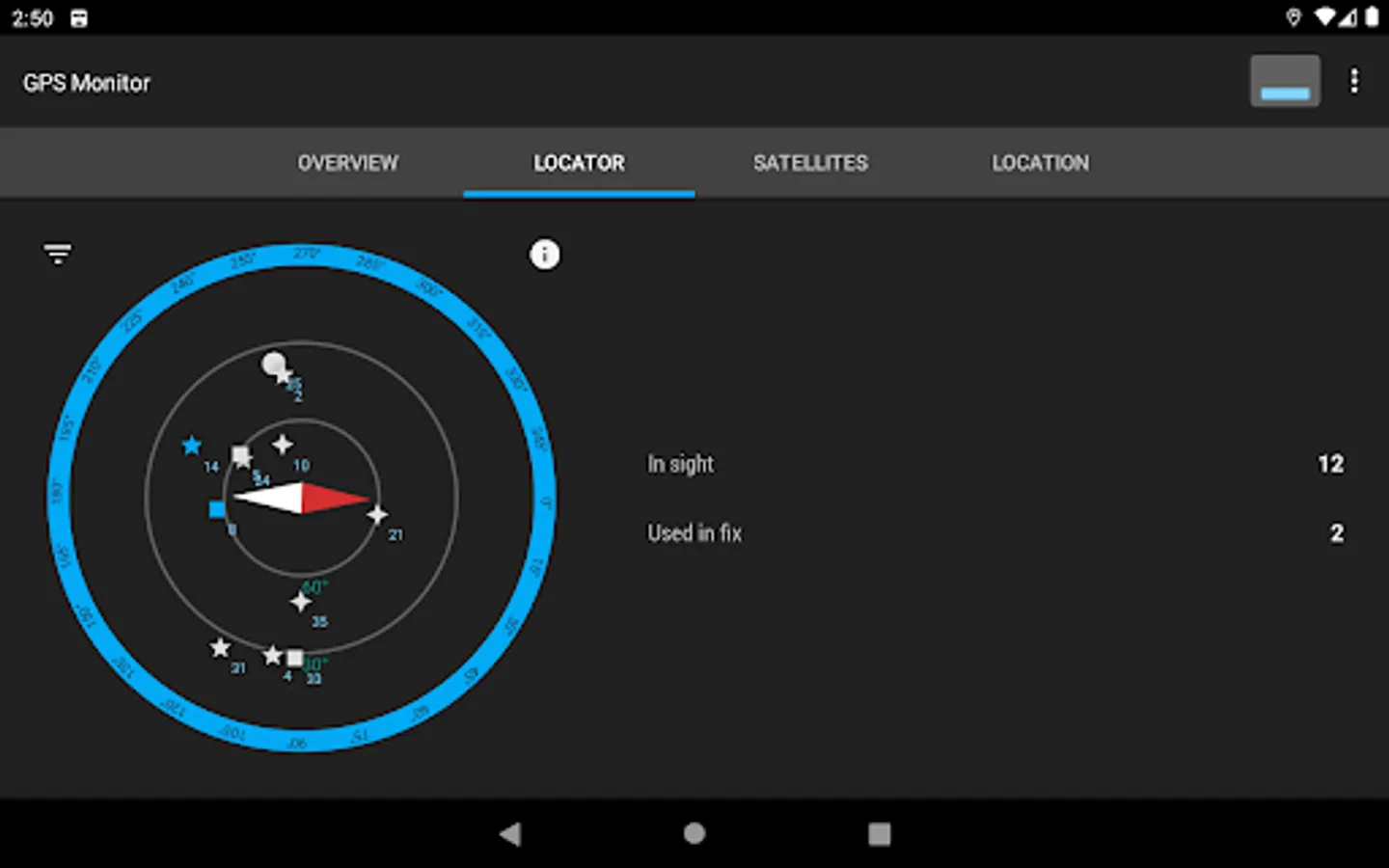 GPS Monitor helps you to check navigation satellites explored by your device and location information they provide. The application displays the objects of the following global navigation satellite systems (GNSS): GPS, GLONASS, Beidou, Galileo and other systems (QZSS, IRNSS). In addition, you can get your current latitude, longitude, altitude, heading and speed data. The application does not require an Internet connection, so you can determine the location even in airplane mode.