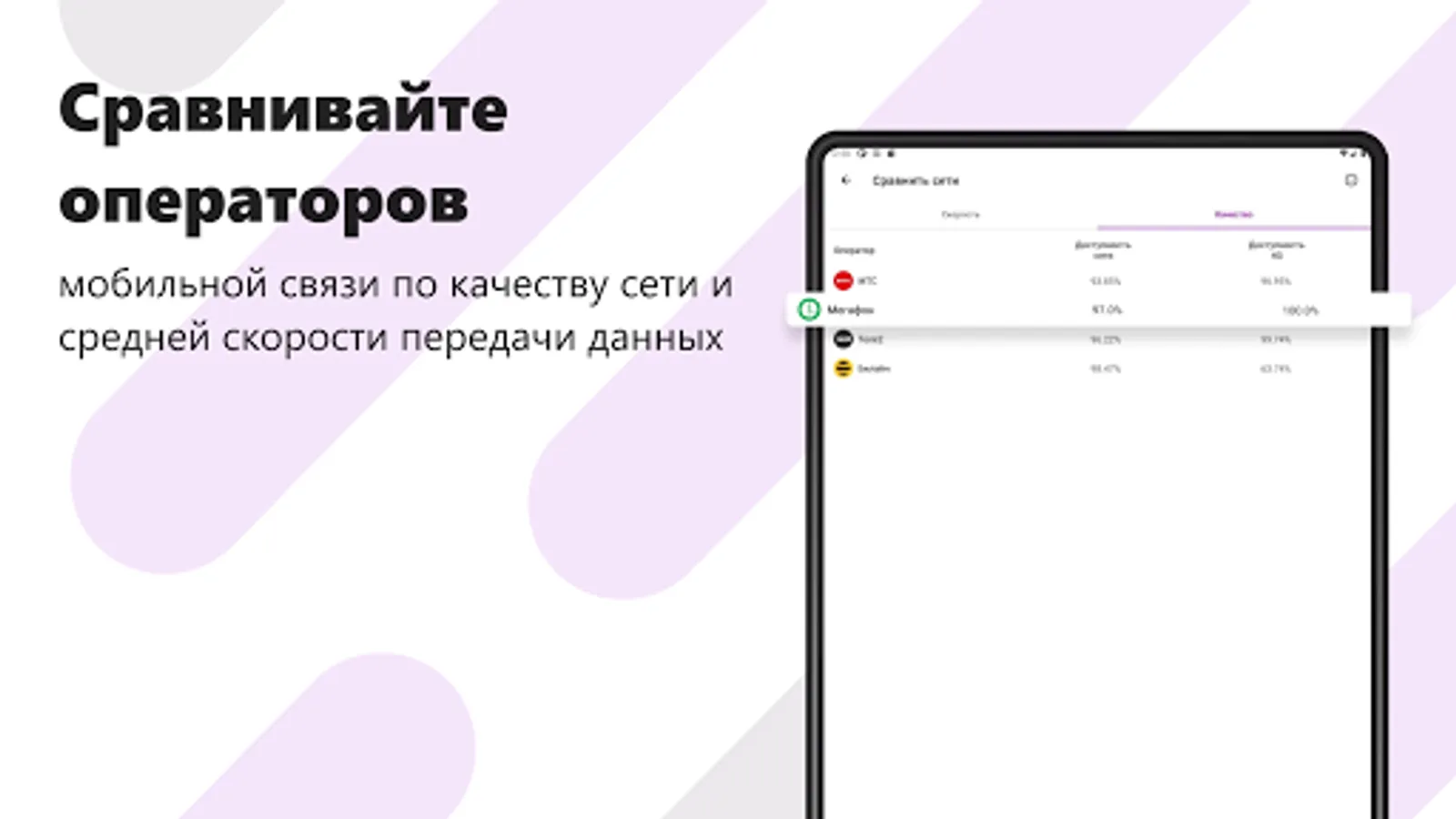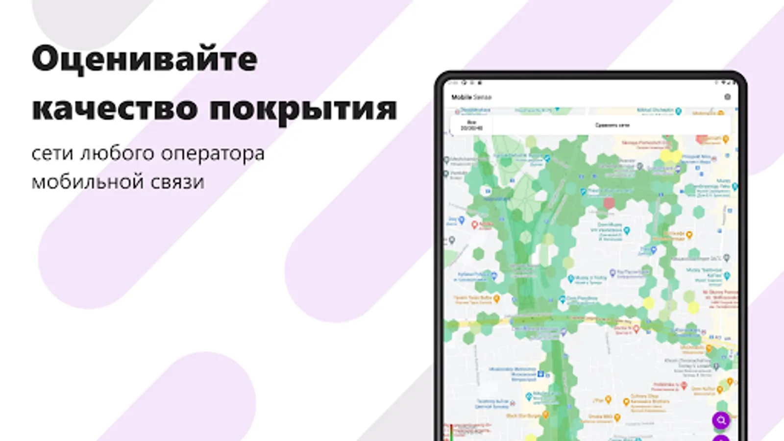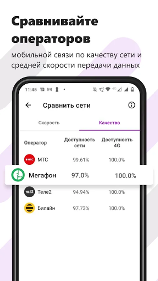 • COMPARISON OF NETWORKS. You can always compare and select the best mobile operator in terms of coverage quality and average data transfer rate for your chosen territory.