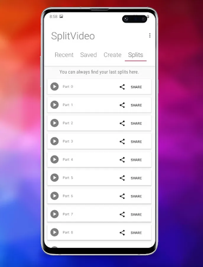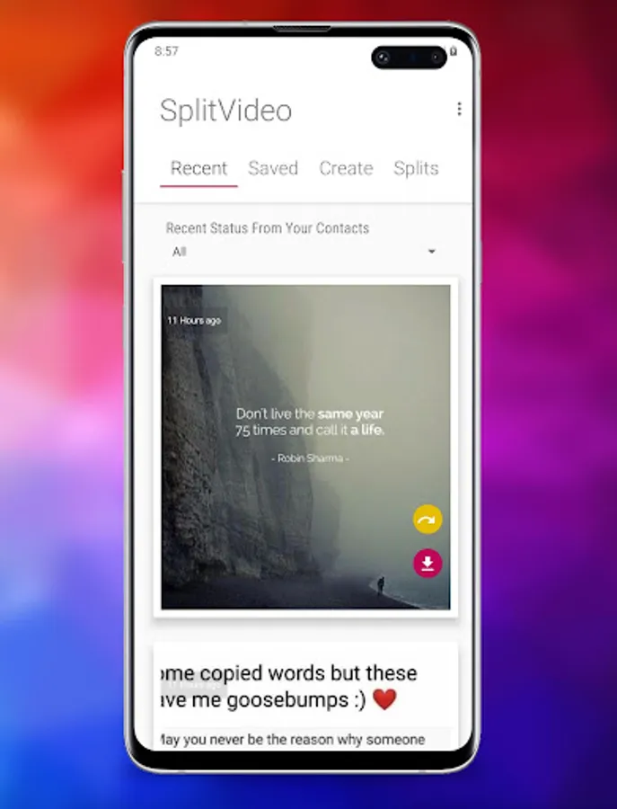 SPLIT VIDEO FOR WHATSAPP STATUS is a FREE status saver and video trimming application available for Android devices. You can now leave the strenuous task of finding your contact's status videos and also splitting long videos for making it as whatsapp status. Simply browse through your contact's recents status or saved status and share the videos. For splitting videos into parts, simply choose the video from your device. SPLITVIDEO: FOR WHATSAPP STATUS does it for you.