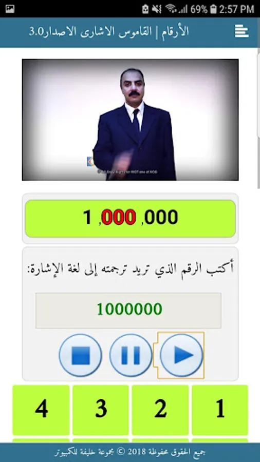 • It contains a special screen for numbers to display the signs of numbers from 1 to the billionth number, with the property of translating the numbers after writing them into sign language correctly, taking into account the digits and categories up to the billionth digit