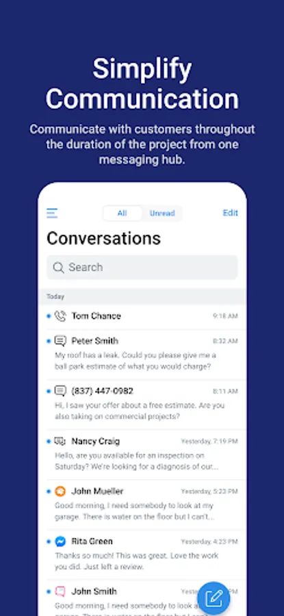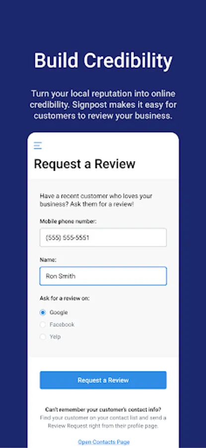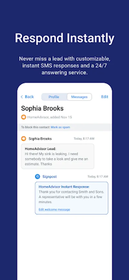 Signpost helps home service businesses respond to leads, simplify communication, and build a credible online reputation. 78% of jobs go to the business that responds first. Convert more leads by responding instantly with custom text messages. Provide a better customer experience with the Signpost app by effectively communicating with customers throughout the duration of the project from one messaging hub. Signpost users can answer business inquiries, confirm appointments, and share images. Send review requests in seconds from the Signpost app after a job well done to take your online reputation to the next level. Each contact will have a comprehensive history within their profile, painting a full picture of that customer's journey with your business.