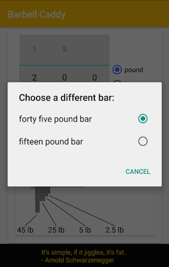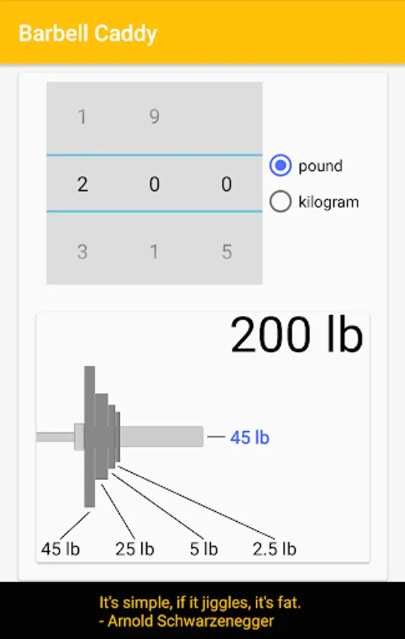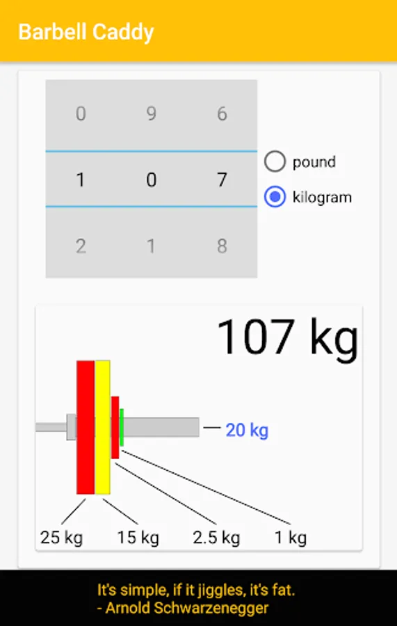 Barbell Caddy does the math for you. Simply tell it if you want to lift in kilos or pounds and give it a weight. As you scroll through the different weights the plates fly onto the bar! Various bars are available in both kilos and pounds.