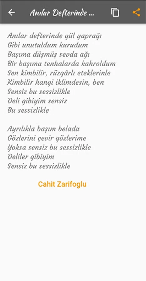* You can copy and share some of your favorite poems with a button or all of them with a button.