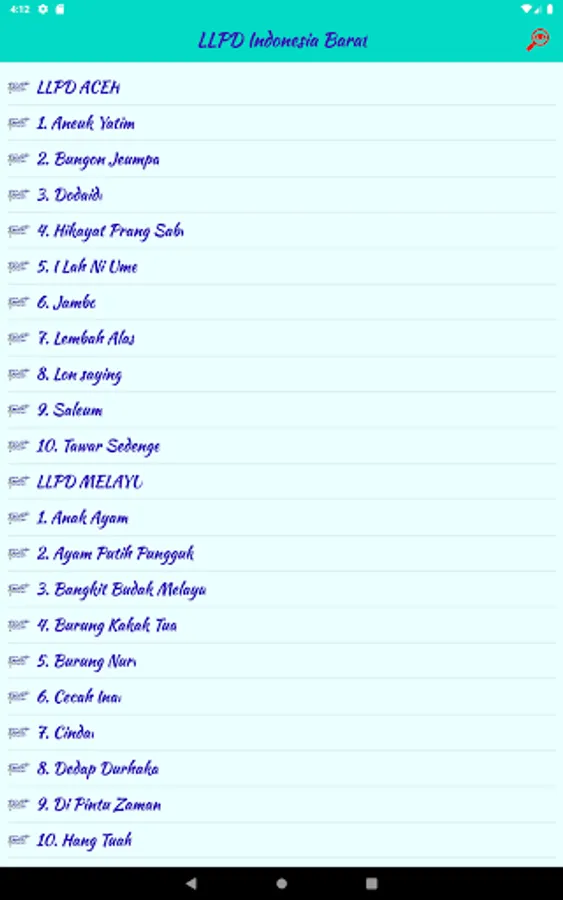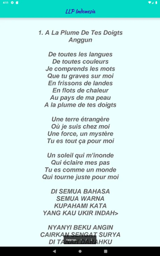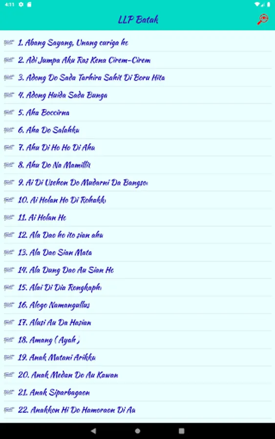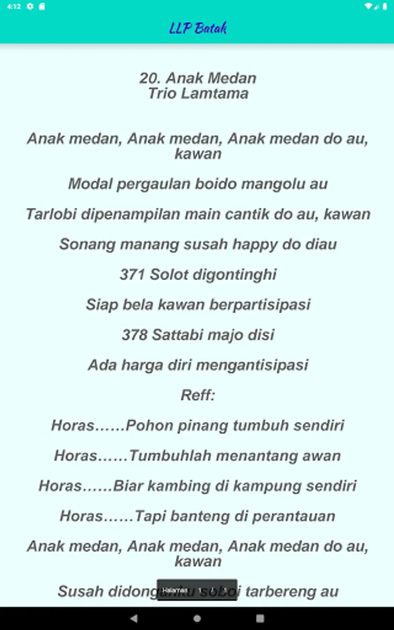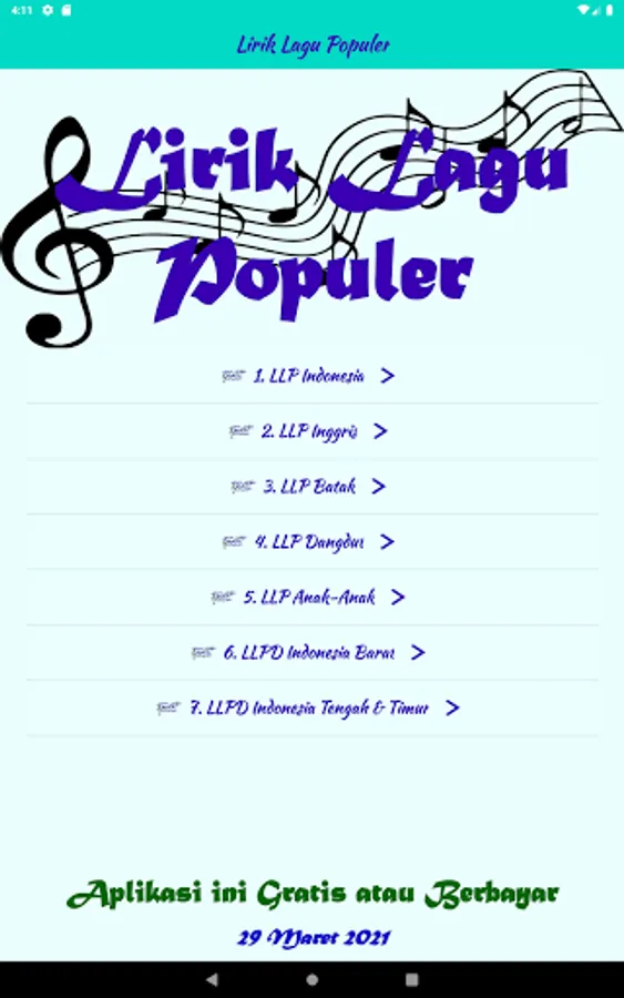 This Popular Song Lyrics application is a re-editing of the lyrics of Popular English, Indonesian, Batak, Dangdung, Children's, and Regional Popular Songs in Indonesia.