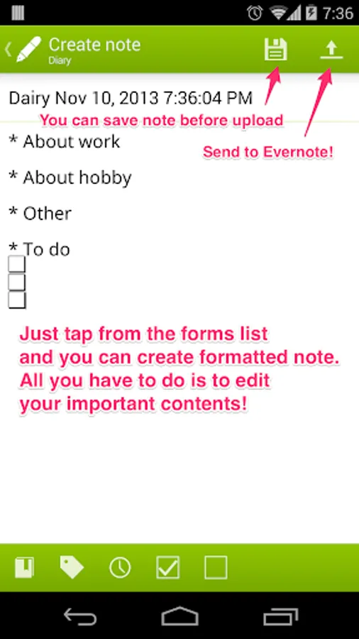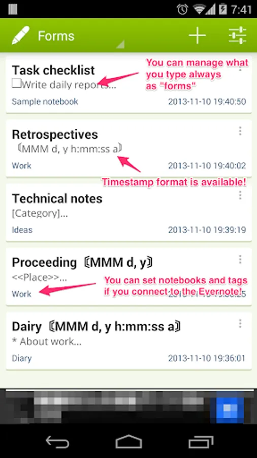 This app can save formats(templates) and you can create new note from the format with only 1 tap.