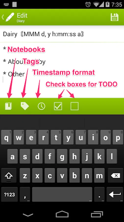 - You can now enter the format of the date, it is now possible to automatically insert the date and time of creation to note when creating.