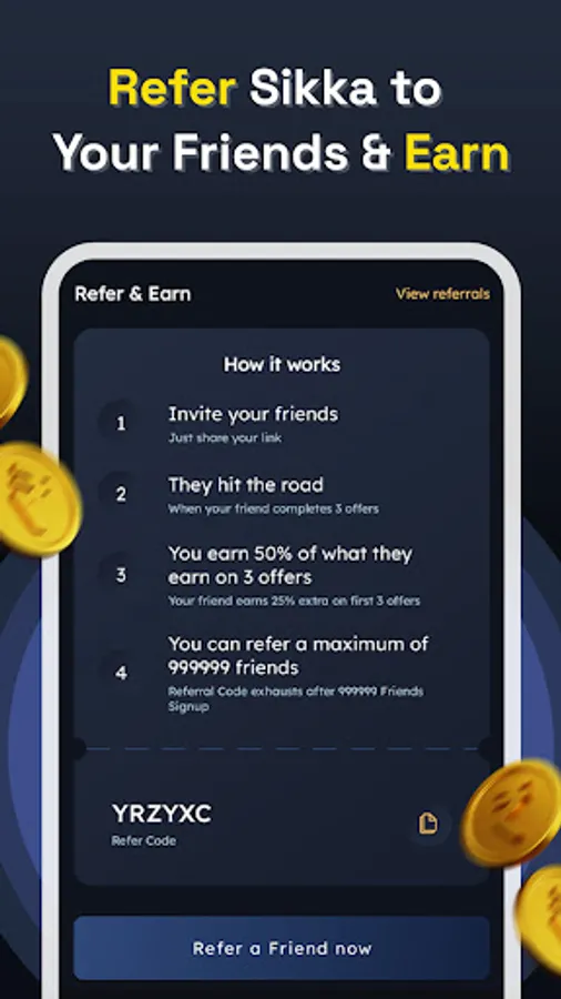 -You can even earn more bonuses by referring to the best money earning app Sikka to your friends and family. Share your Sikka App’s referral code with them and cash out exciting benefits.