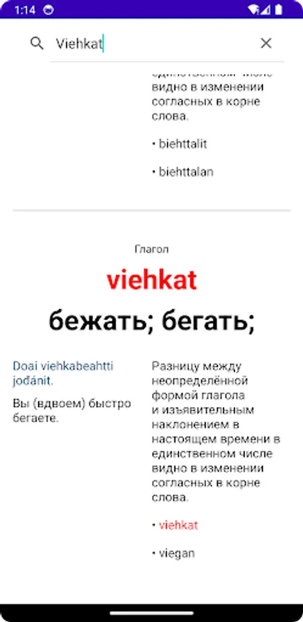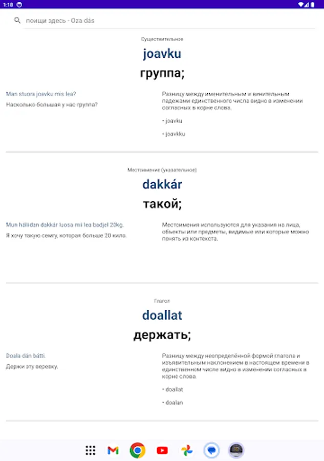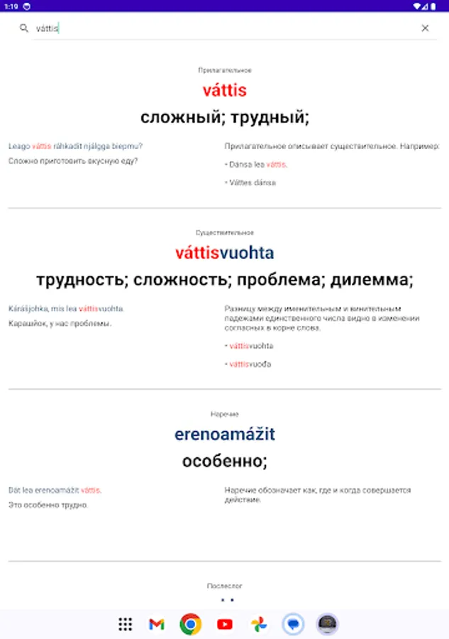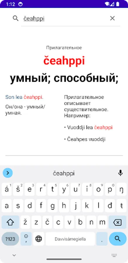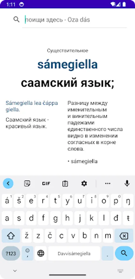 Этот учебный словарь – приложение, которое содержит примерно 1300 самых распространённых слов северосаамского языка. Саамские слова, простые фразы и предложения переведены на русский язык. Это приложение создано для носителей русского языка, которые хотят познакомиться с основами саамского языка. Этим приложением могут пользоваться также носители саамского языка, начинающие изучение русского языка. Приложение содержит функцию быстрого поиска слов. В приложение включены самые наиболее употребляемые глаголы, существительные, наречия, прилагательные, частицы, числительные и местоимения.