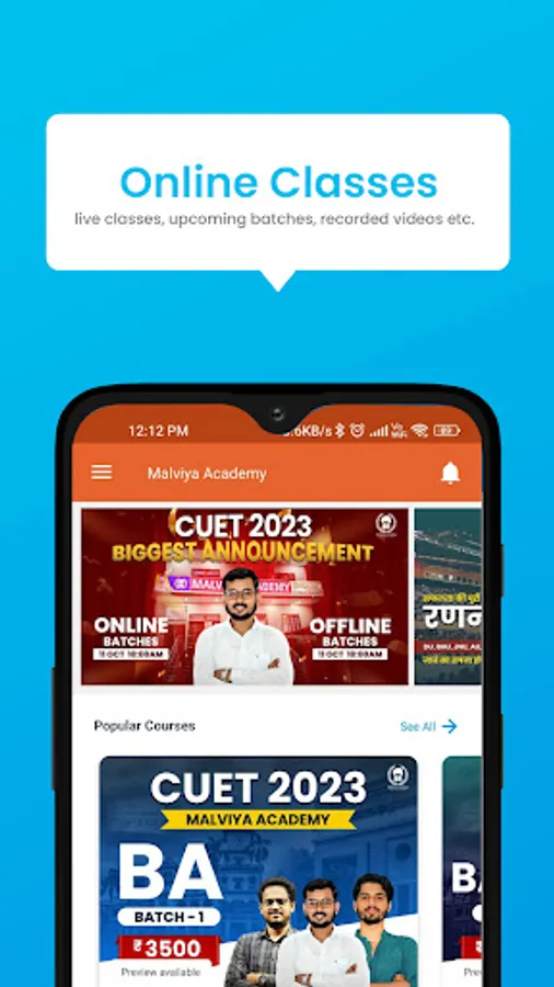 नमस्कार दोस्तों आप मालवीय एकेडमी के ऑनलाइन और ऑफलाइन कोर्स से जुड़ कर CUET 2023 प्रवेश परीक्षा की तैयारी कर सकते हैं। ऑनलाइन कोर्स के अंतर्गत हमारे किसी भी कोर्स की फी ₹ 3500 ( Including 18% GST) है | ऑफलाइन कोर्स के अंतर्गत हमारे किसी भी कोर्स की फी ₹ 14000 है | हमारी क्लास निम्न कोर्स के लिए आई है ।