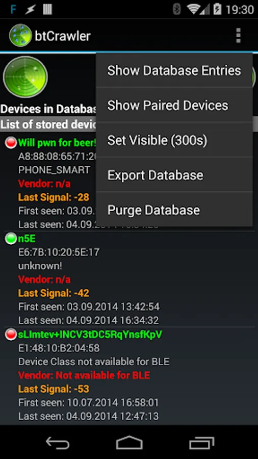 The Database can be exported to a csv file on the external storage. Filename is: btcrawler-.csv