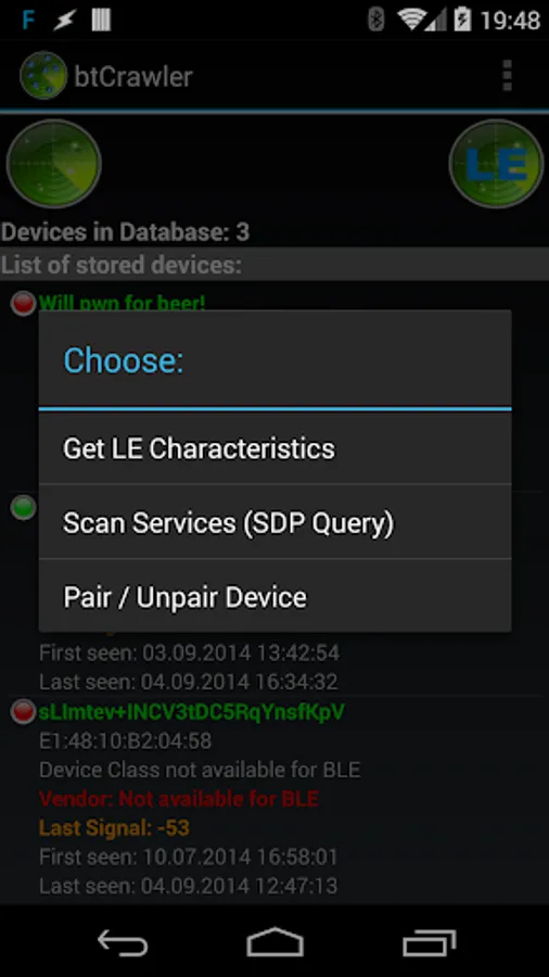 - Shows Device Name, BDADDR (like MAC), Class of Device, Vendor and Signal Strength