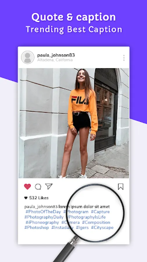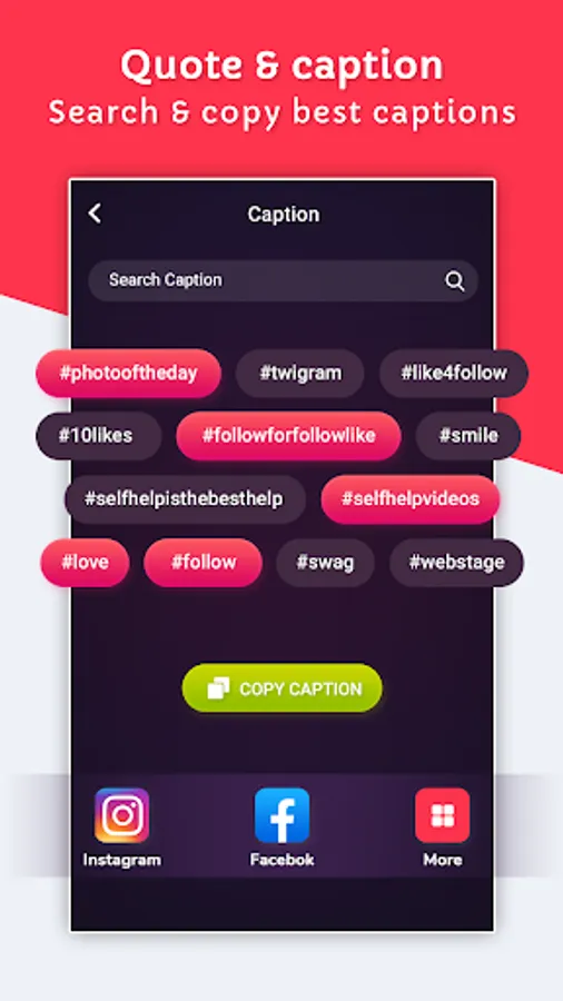 This app contain HashTags - Captions also, HashTags - Captions is the app help increase likes and follower for your Facebook, Twitter and Instagram easiest and fastest