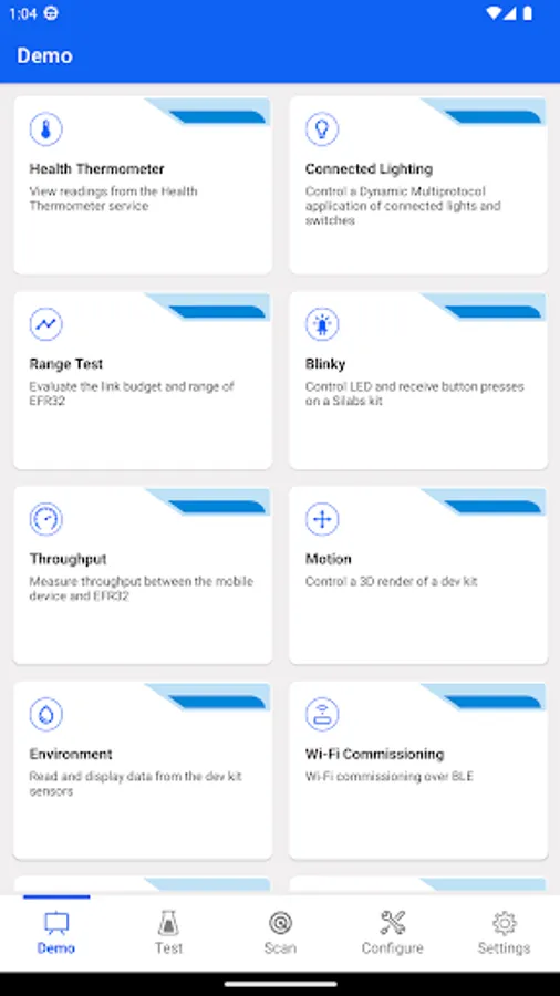 Simplicity Connect includes many demos to test sample apps in the Silicon Labs GSDK quickly. Here are demo examples: