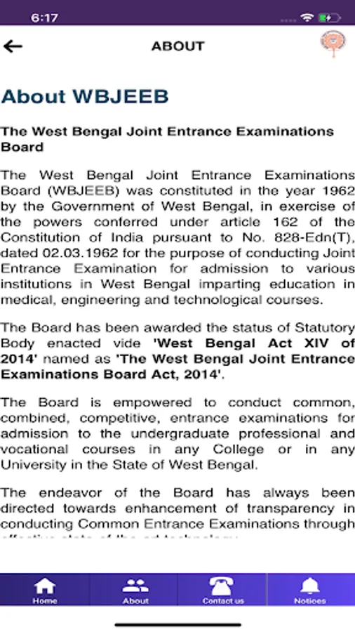 The West Bengal Joint Entrance Examinations Board (WBJEEB) was constituted in the year 1962 by the Government of West Bengal, in exercise of the powers conferred under article 162 of the Constitution of India pursuant to No. 828-Edn(T), dated 02.03.1962 for the purpose of conducting Joint Entrance Examination for admission to various institutions in West Bengal imparting education in medical, engineering and technological courses.