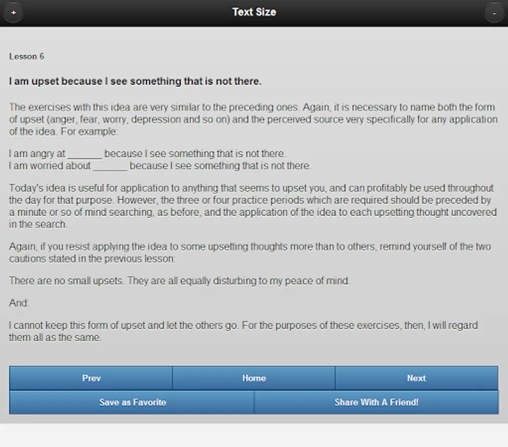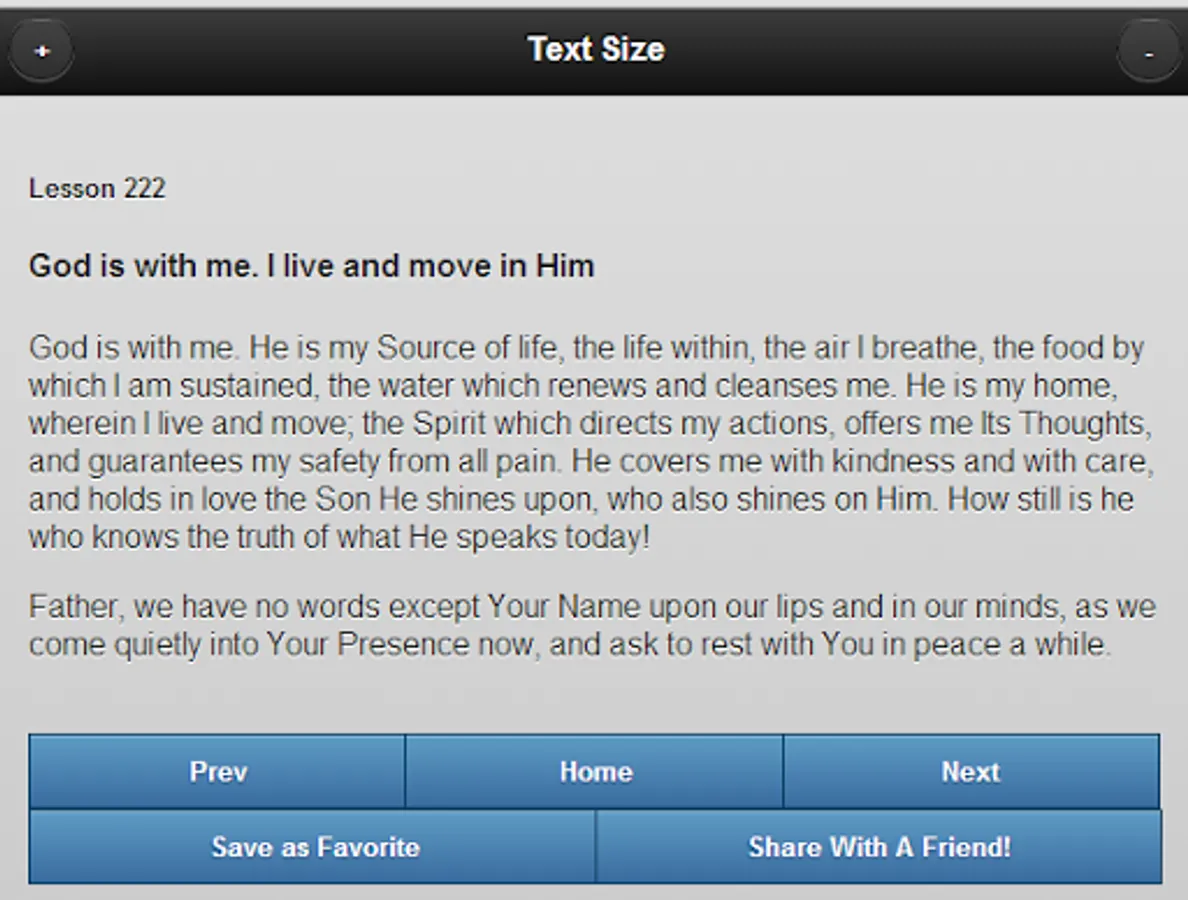 Save your favorite lessons for instant access. Also, share any lesson with a friend. Just pick a lesson to share and the app will automatically place the text in an email, all you have to do is to supply the Send-To address.