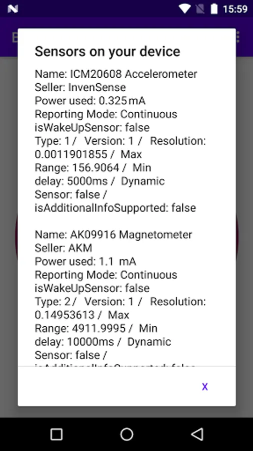 In addition, this application allows you to display the list of sensors of your device by clicking on the action bar