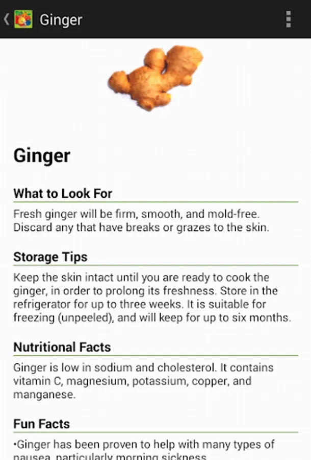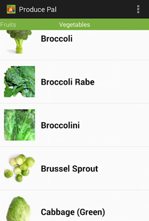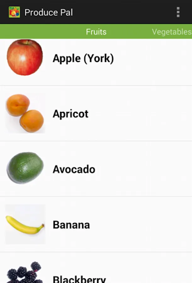 Produce Pal has a database of over 120 different fruits and vegetables. Is there something that we missed? Just let us know and we'll put it in the next update. Each produce item has a description of: