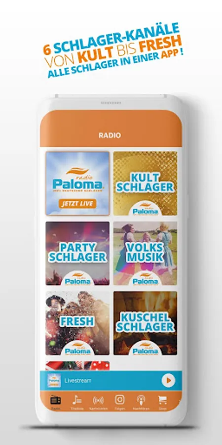 Anyone who loves hits can listen to Radio Paloma! Because the hit is at home here. Radio Paloma is committed to the whole variety of the hit. The spectrum of Schlager music can be heard on six channels: whether it is a cult hit, a party hit, folk music or the new generation of Pop Schlager - there is something for every Schlager fan!