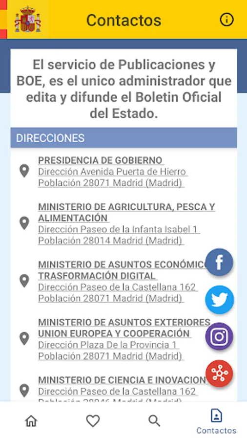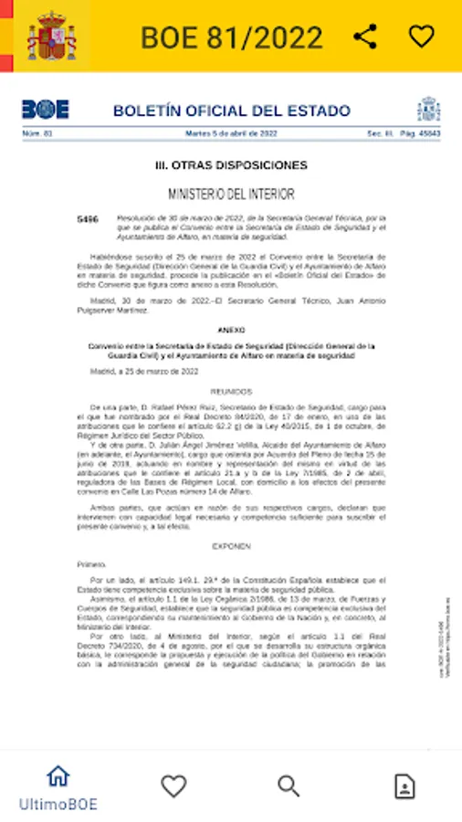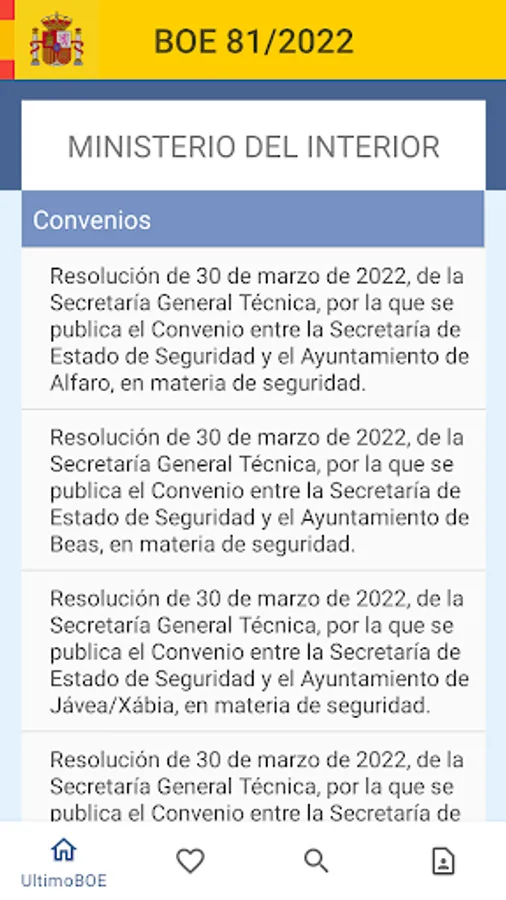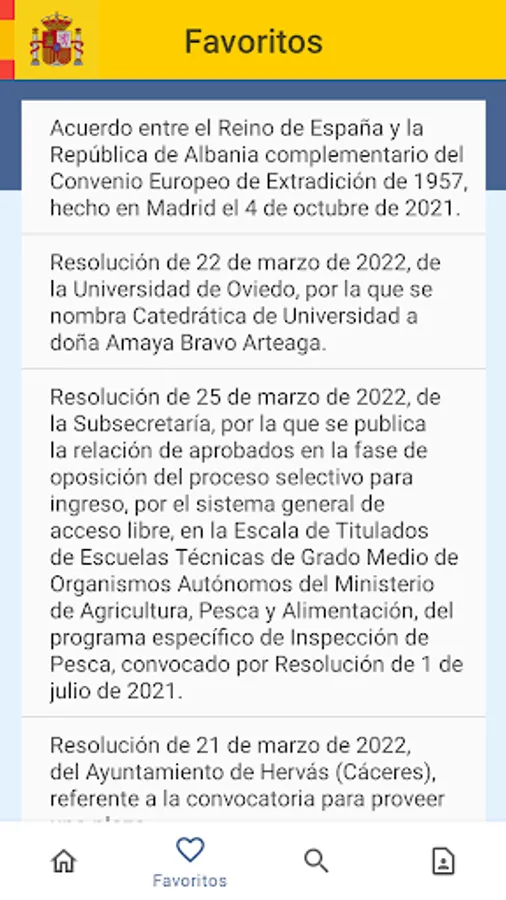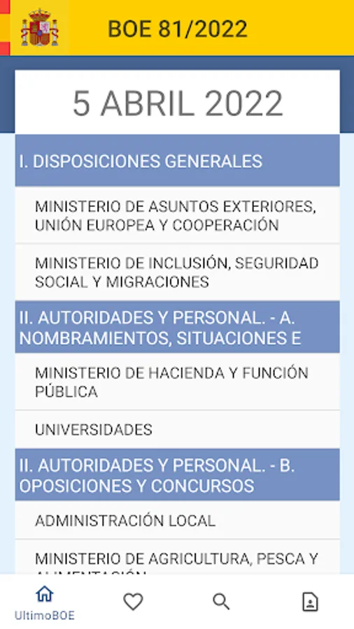 Official Gazette is an application developed by SILA Tools to allow consultation through mobile devices, smartphones and tablets, of the information from the Official State Gazette. It is constantly updated with the reuse of information from the RSS of the electronic edition of the Official State Gazette that is published on the State Government portal. This version contemplates the following operations: consult the last available newspaper, search for a newspaper on a selected date, filter newspaper articles by section, search for articles according to their rank, as well as add and delete articles in a favorites list.