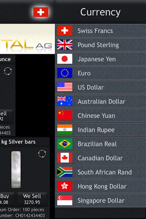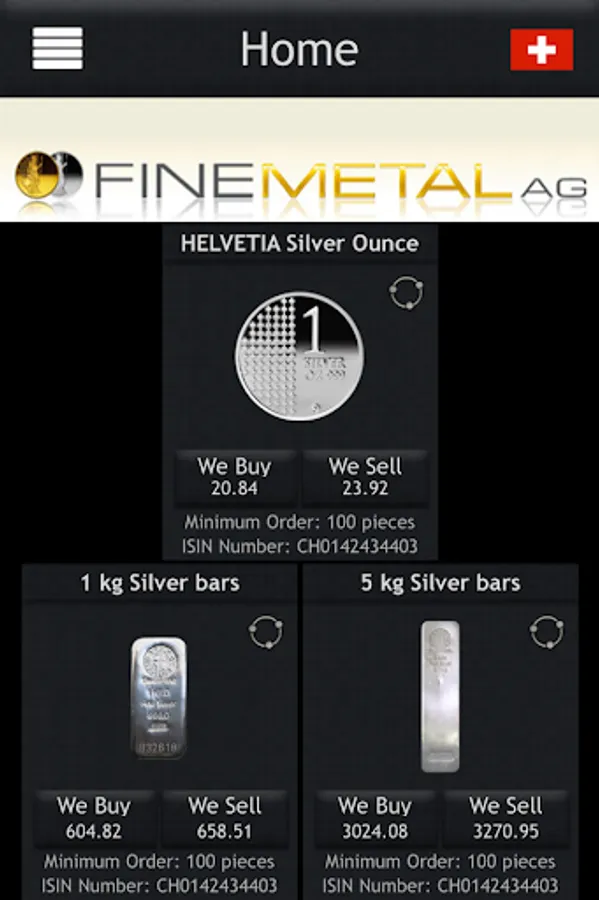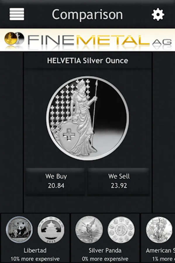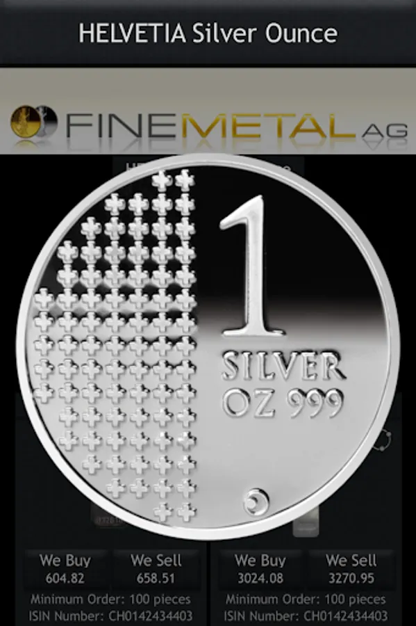 The Finemetal App offers users the price of one Helvetia Fine-Silver Ounce in the desired currency, in real time.
