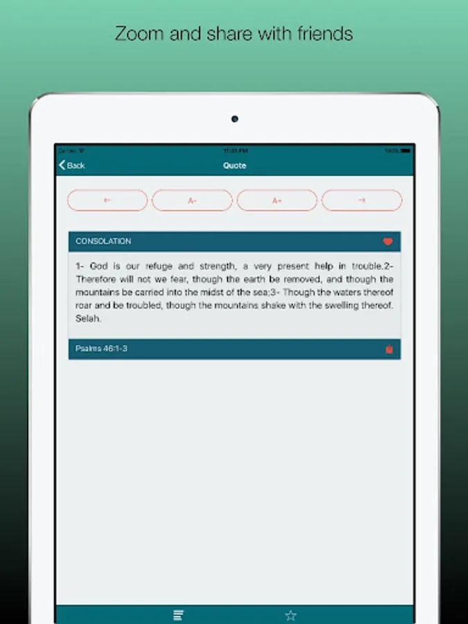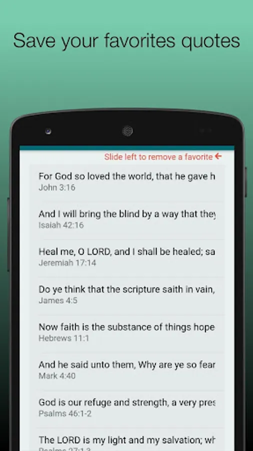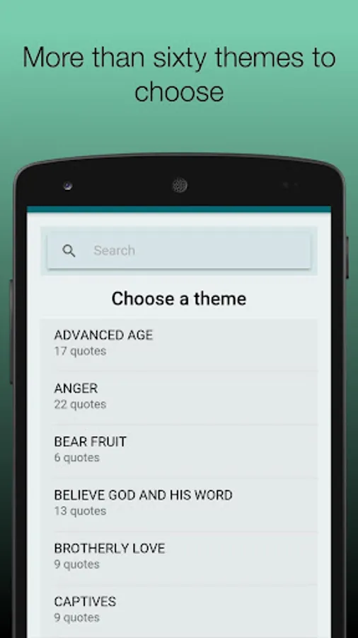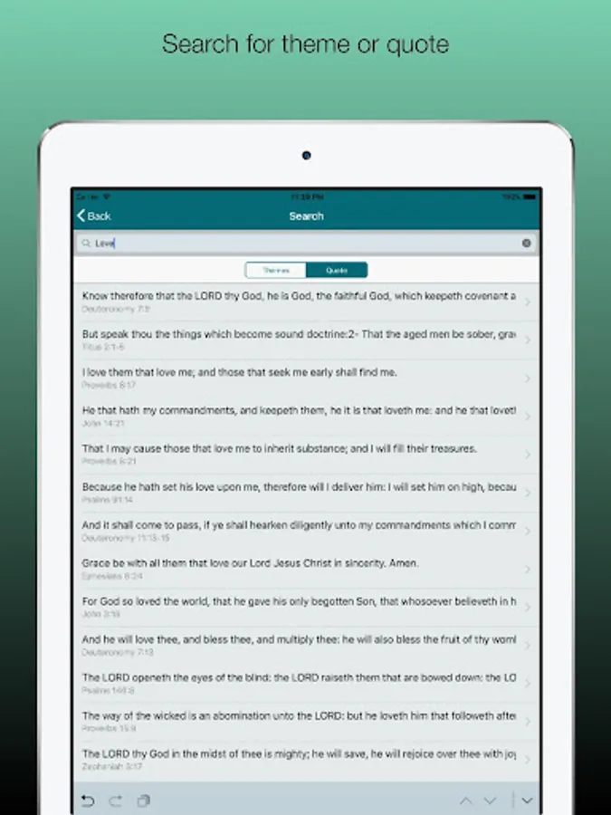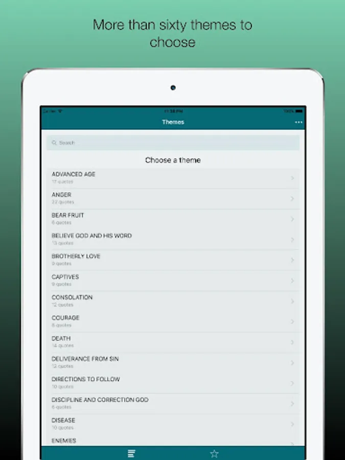 Do you need words of encouragement? Looking for inspirational bible quote from the Holy Bible? You want to meditate daily on your favorite bible verse? This application will help you through its Bible verses classified in 69 topics to find the comfort, knowledge and inspiration you need.