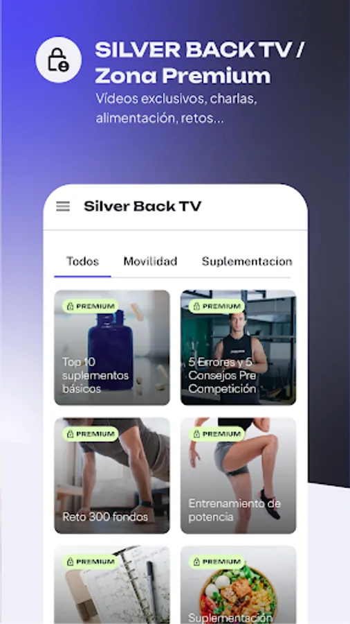 Silver Back Training is the training platform for Samuel Torres PT and it is perfect for you. Train your way and reach your full potential! It does not matter if you are a beginner or an expert, here you will find a personalized plan that fits your needs. Become a true "Silverback", strengthening your body, improving your health and posture, and avoiding injuries. Get ready to dazzle with your results and push your own limits! You will find training plans for different disciplines that can be combined with each other. In each program you will find the planning of the exercises to be carried out each day and explanatory videos so that your technique is perfect. Also, if you choose the Premium plan, you will be able to enjoy Silver Back TV, a constantly growing collection of videos in which you will learn about personal development, nutrition, supplementation, performance, challenges and much more.