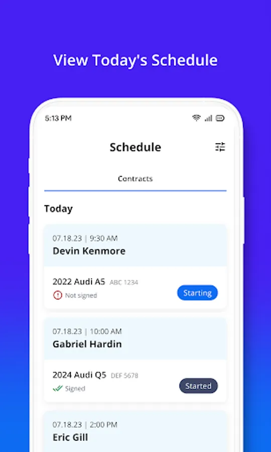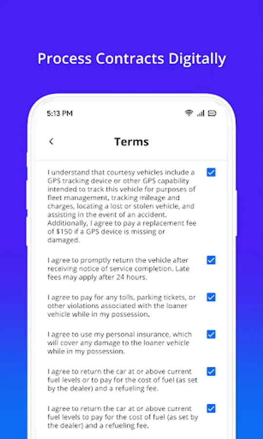 Transform the way you contract and manage fleet vehicles with the Dealerware mobile experience. Not only can you contract your customers from anywhere from any mobile device, but you can also easily plan for your day with a robust daily schedule to keep your service lane moving at record speed. Quickly scan customer driver license, credit card, and insurance information at contract start, and then instantly bill customers for fuel, mileage, or damage at contract close.