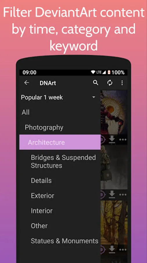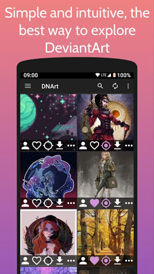 - Browse DeviantArt content (images, git, drawings, fan art, photos, etc...)