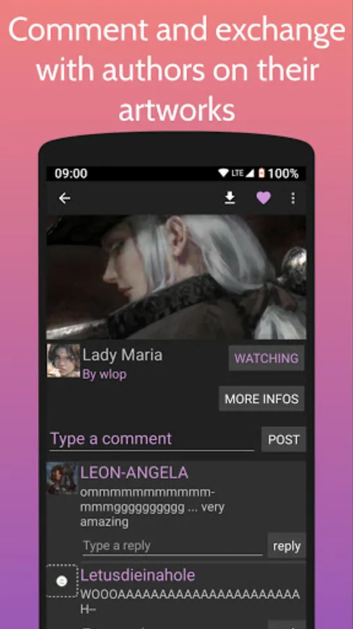- Exchange with your favorites artists on a piece of art or on their profile