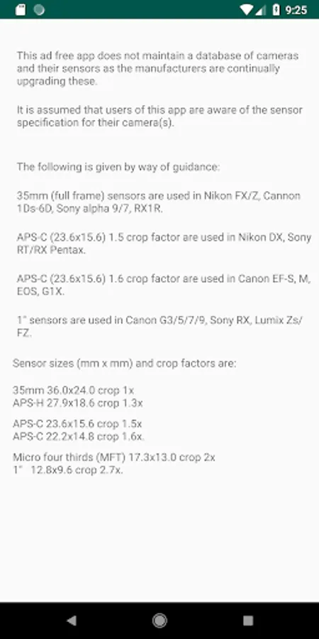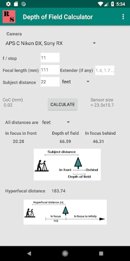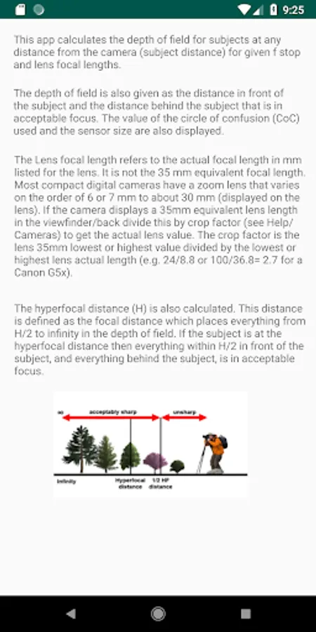 There are many excellent Depth of Field apps available, a number of which are quite complicated. This app is deliberately simple and allows user type input into the calculation of depth of field and hyperfocal distances. The selected camera is saved for future use as are the distance units.