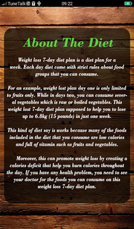 This "Weight Loss 7 Day Diet" App gives a complete breakdown of the foods to eat on all the 7 days.