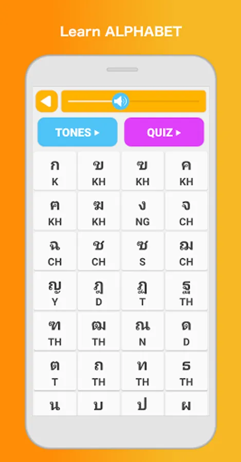 You can learn to recognise and read Thai characters, and pronunciation in the Alphabet Section of this app.