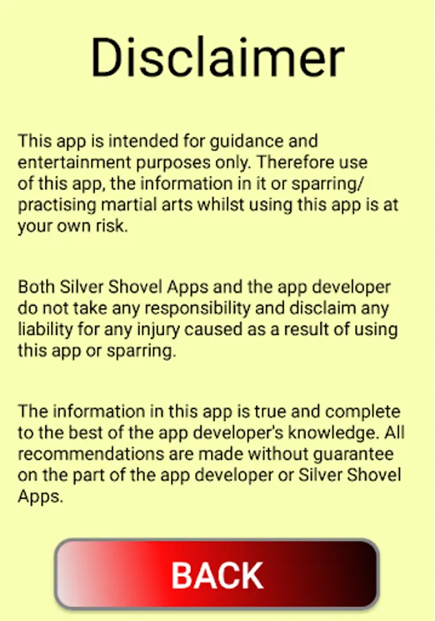 This app is intended for guidance and entertainment purposes only. Therefore use of this app, the information in it or sparring/practising martial arts whilst using this app is at your own risk.