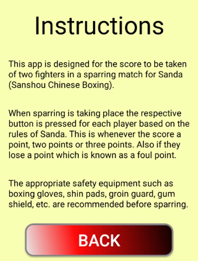 This app is designed for the score to be taken of two fighters in a sparring match for Sanda (Sanshou Chinese Boxing).