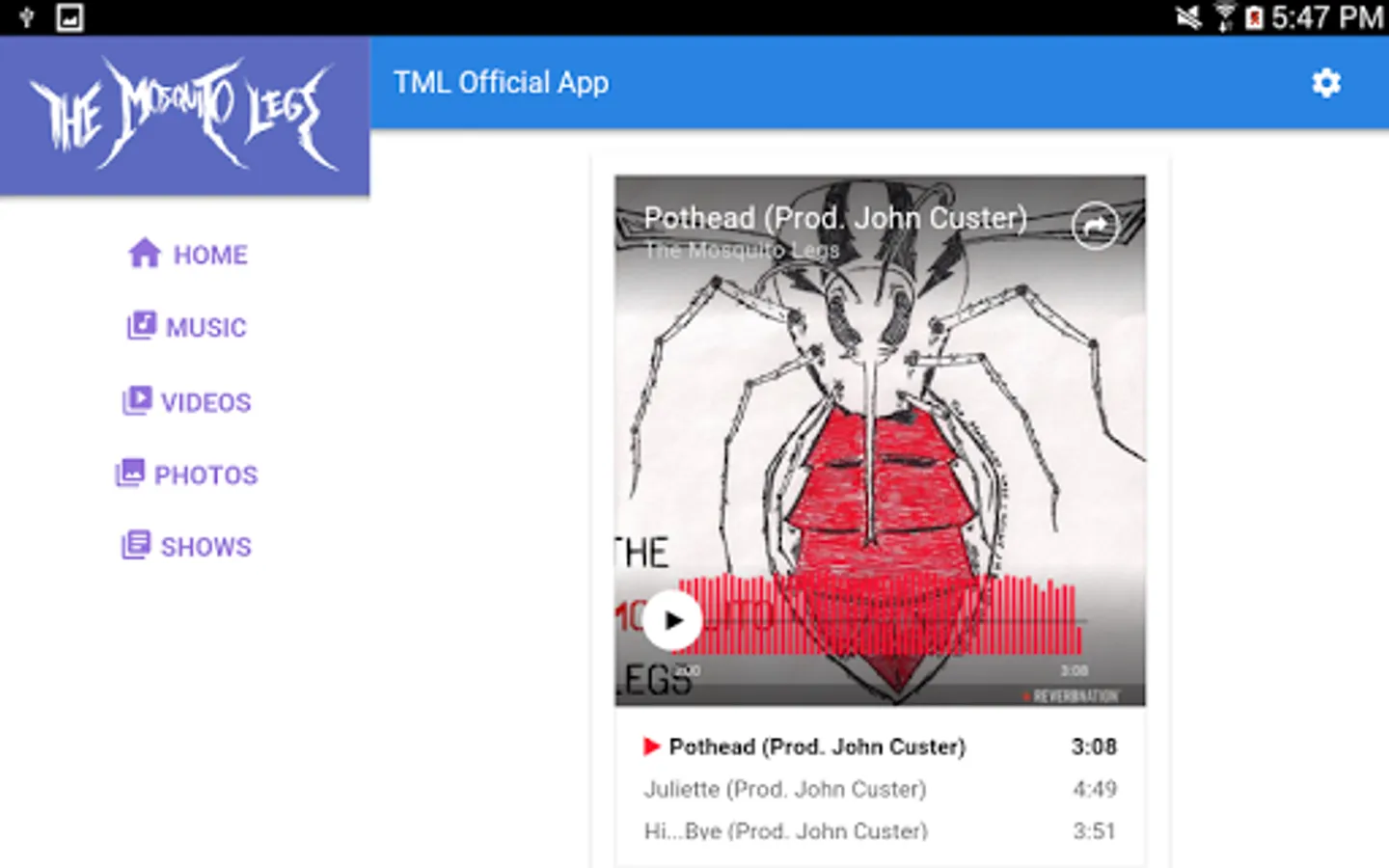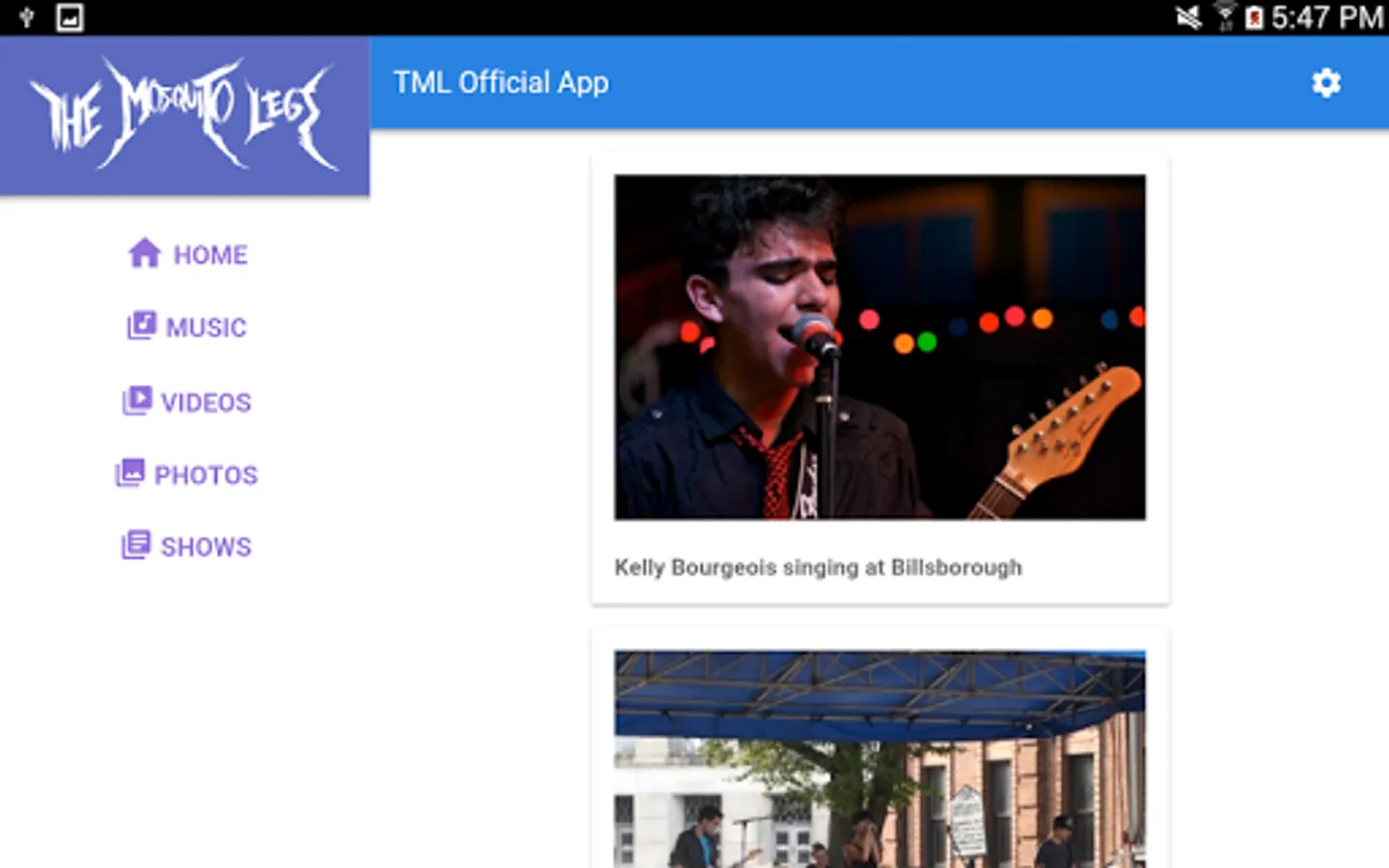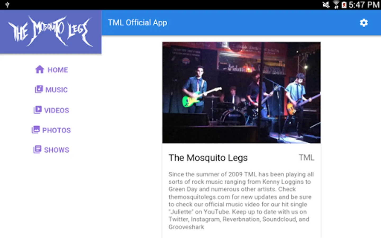 The Mosquito Legs official app showing news, photos, videos, upcoming shows, and more!