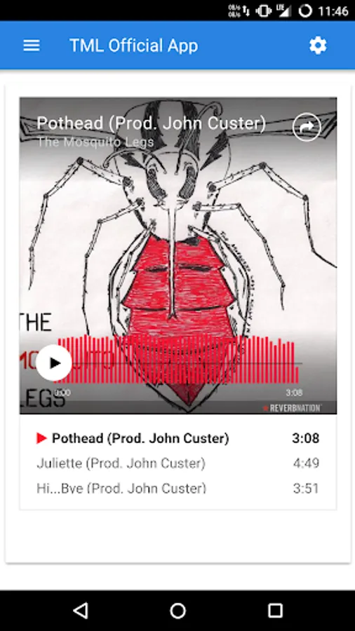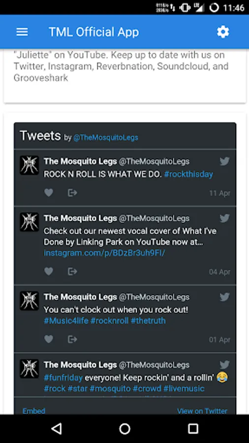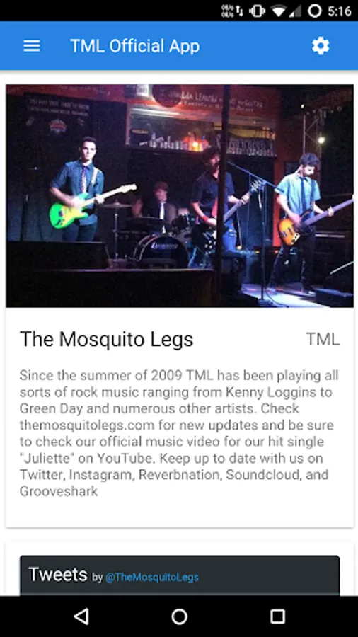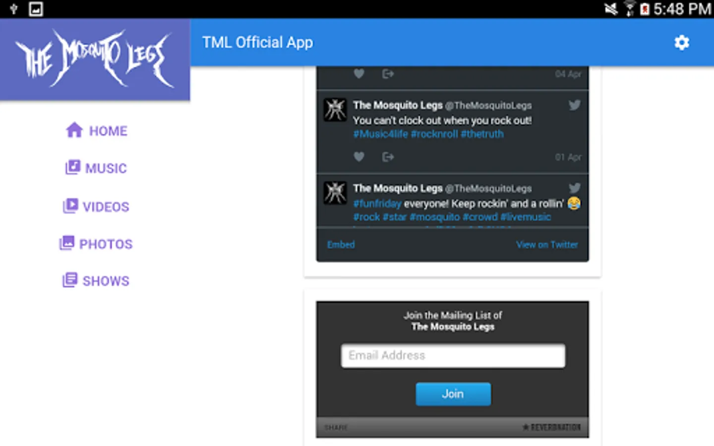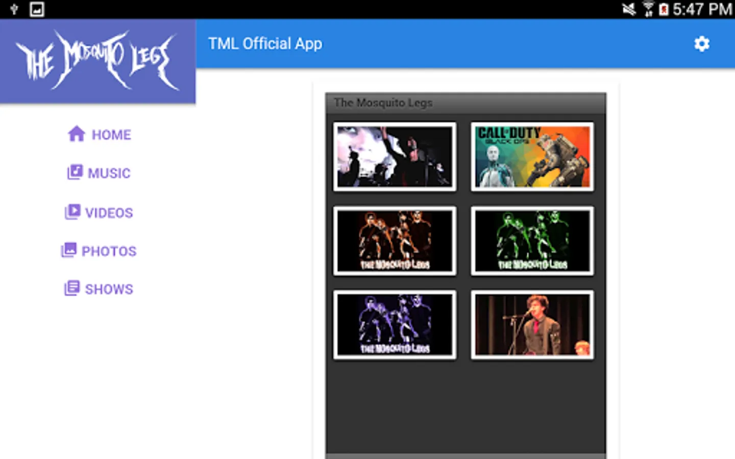 The Mosquito Legs official app showing news, photos, videos, upcoming shows, and more!
