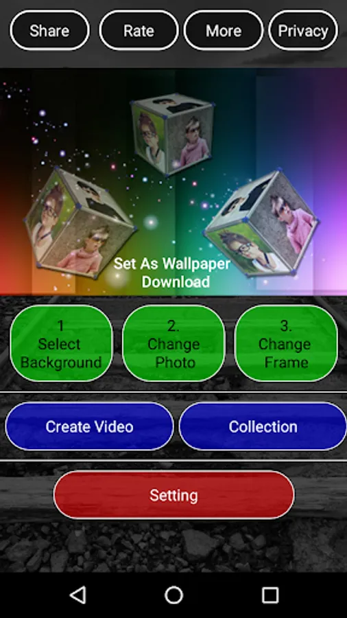 This 3D My Photo Cube create video features a rotating 3d cube showing pictures and photos from your gallery. Increase or decrease motion of photo cube on main screen.