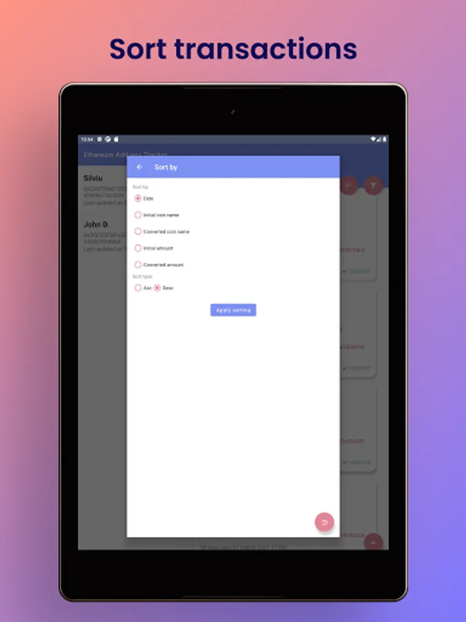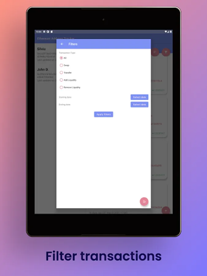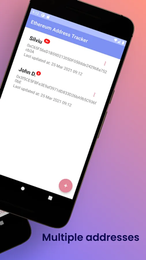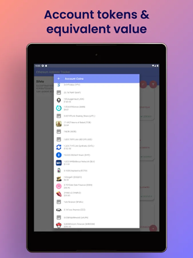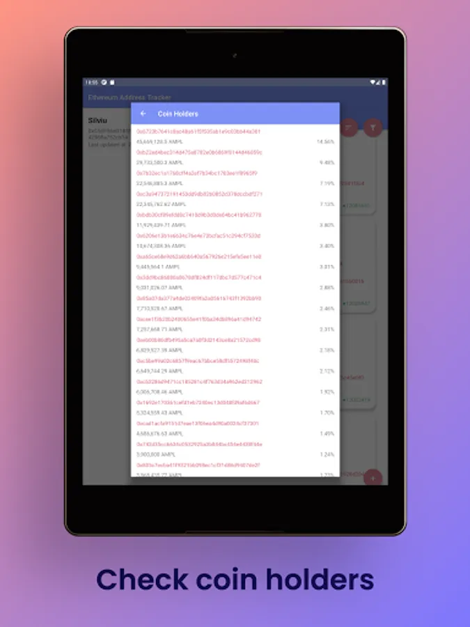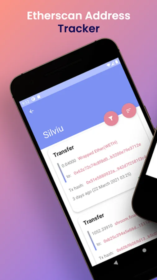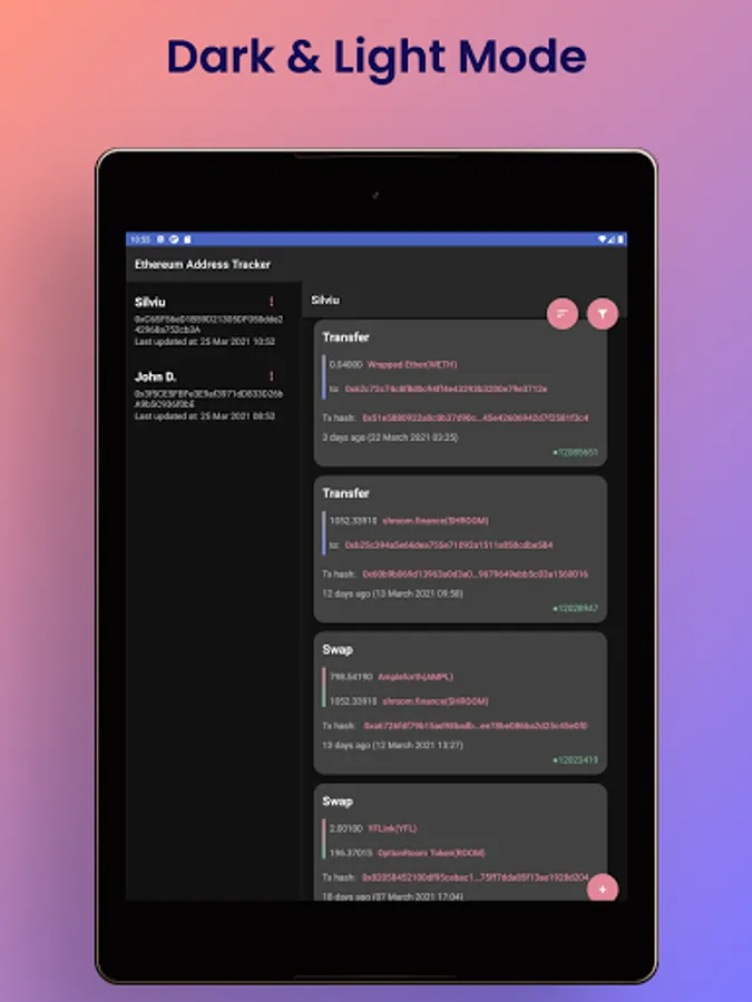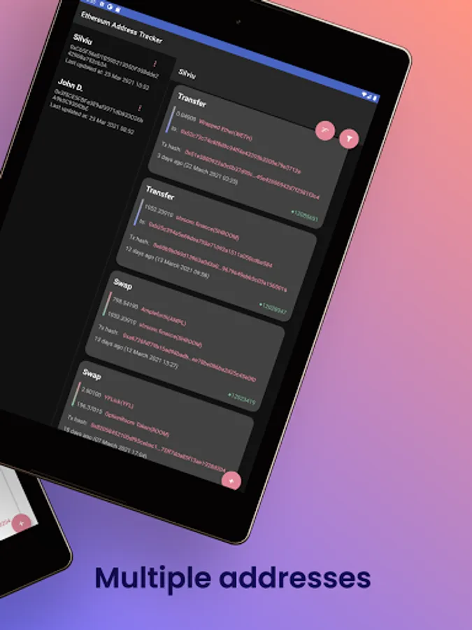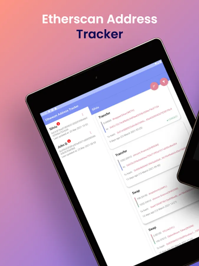 Address Tracker for Ethereum is an app that allows you to track ERC20 transactions of public addresses easily, on phones and tablets.